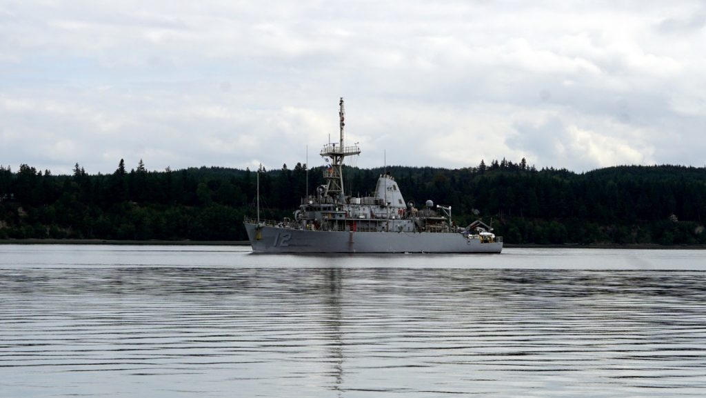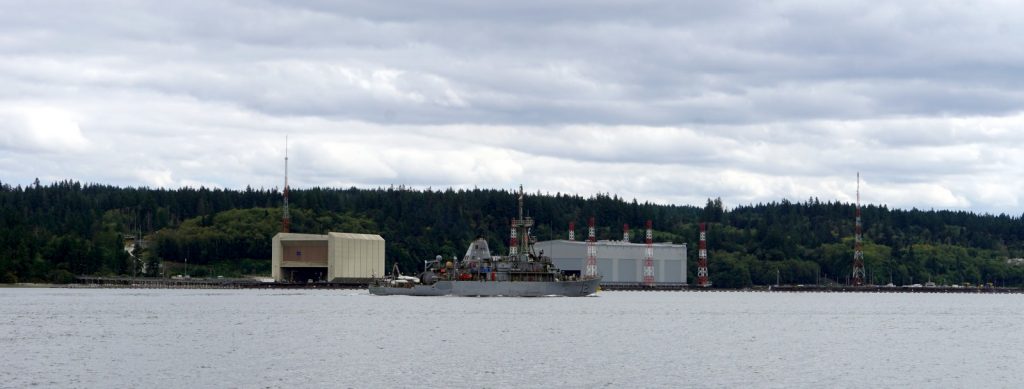 Once through the bridge we were only a third of the way to our destination. Many more miles had to be traveled, and many of those miles were in spitting distance of Naval Base Kitsap on the eastern shore of the channel. The base is a service point for all the Navy ships and subs in the Puget Sound. It is both required and customary to give military bases, and their ships/subs, a wide birth when nearby. We stayed well to the western side of the canal and made no sudden movements. Unfortunately, no nuclear subs were being escorted in or out of the base, so we did not get to see any. Only one smaller ship, that seemed to be out on a short patrol of the canal, was out that day. Maybe on our way back up the canal we will get to see a sub.