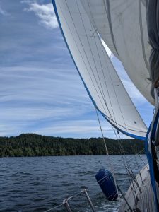 Finally, approaching 8 pm now, we performed our final jibe, started dropping the sails, and motored in to our destination at Potlatch State Park where a plethora of mooring balls awaited our arrival. We picked up a ball on the first try, with an audience of one from a neighboring boat. We are pro’s at this, buddy.