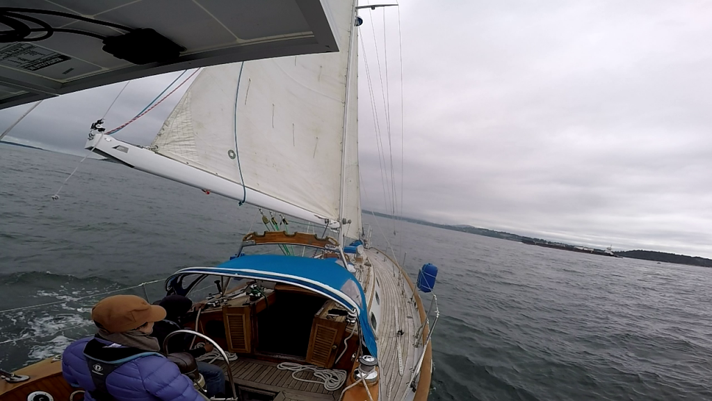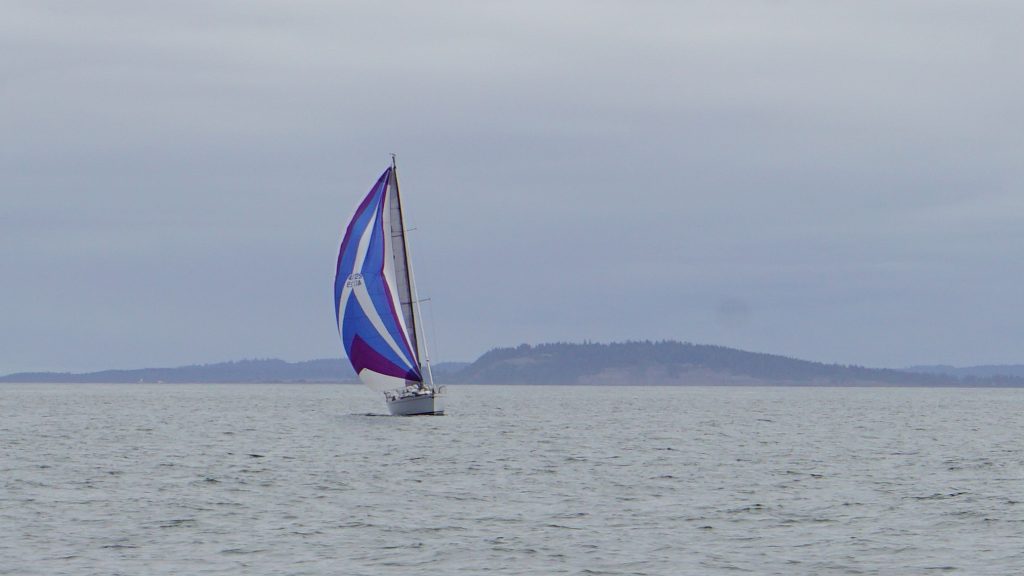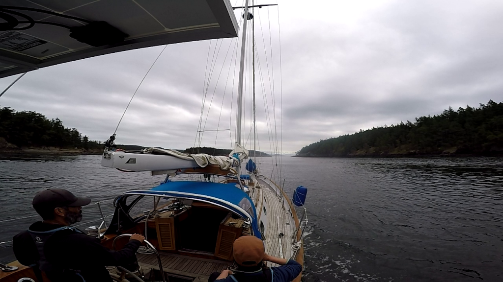 Things began to relax as we sailed past Port Townsend. As much as we would have liked to have pulled into PT and stay, with most things still closed there wasn’t much of a draw to stop yet. We would wait until later in the year. We sailed on towards Port Hadlock, another hour to the south. Once we were heading mostly down wind, I dropped the staysail and packed it away. Then Kerri and I set about dropping the main to flake and cover it in the quiet of a jib-only sail. By the time all the work was complete, we were right on top of where we wanted to drop anchor. At the last moment, I turned towards land and furled in the jib, and only at this moment did we fire up the old diesel motor. As tempting as it was to anchor without it, I’m just not there yet. Especially at an unknown anchorage with a dozen boats to our lee (down wind) on mooring balls.