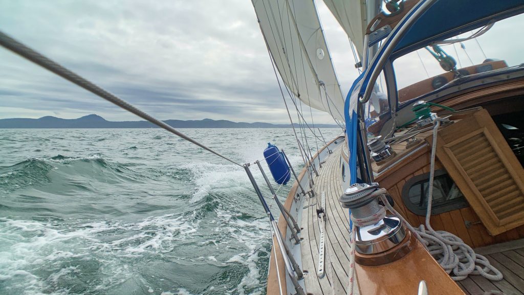 The wind in the Puget Sound, however, likes to play games. If there is one guarantee in a sailor’s day here, it is that the wind will do that one exact thing that you were hoping it would not, no matter the forecast. This day would be no different. As we motored out of Lopez Pass and into Rosario Straight we expected to turn south and have the wind on our beam (side). Instead, the thick-headed wind had decided to come from the south – directly where we wanted to go. This meant we would have to beat against the wind, increasing the mileage out on the water. Not that I minded the extra distance – it is doing our resume a lot of good – but I was very much looking forward to something other than close-hauled and tacking, which we do 90% of the time.