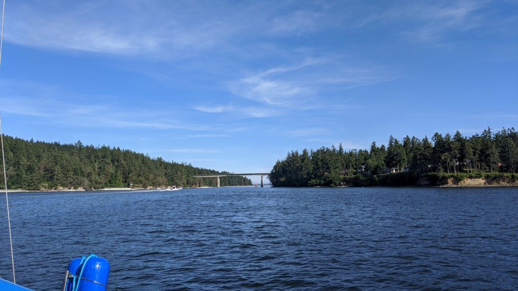 A canal with a low slung bridge lay to our south which we planned to sail the upcoming weekend. I say low slung, but we researched it numerous times over and it is advertised at 58 feet above the high-tide water. Meriwether’s mast is right around 55 feet off the water. Even though all the facts agreed that we would fit, we still wanted to go under the bridge at low tide, which would give us just a little more clearance. And that wasn’t the only thing to consider, as the current flow is exaggerated through these tight canals, reaching 6 knots and above at the worst of time. Not only did we want low tide, we needed a flood tide so we did not have to fight against a strong current. Thursday afternoon was to be the best day and time to pull it off so we set out to motor the three-quarters of a mile to the other side of the canal.  Watching our mast as we started under the bridge was likely the most frightening few seconds in my sailing to date. I knew the math, but none of that logic stuff matters in those few seconds.