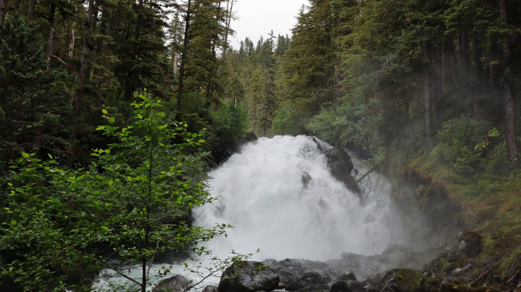 When we came upon Cascade Creek we followed the trail up, towards the roar of Cascade Falls not far away. Once again, it was a scene straight out of Yosemite (with more foliage), but this is just every day Alaska right here. We viewed the waterfall from below, then hiked through the mist and up the hillside to watch from up top. I know Kerri wanted to hike further, but I knew what lay ahead; a two thousand foot climb to Swan Lake. Sounds fun, but we came prepared only for a muddy walk in our sexy ass Xtra-Tuffs, not a big climb – we did not bring our hiking boots. Plus, we still had places to go this day.