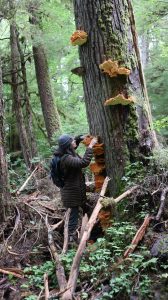 We finally (thought we) found an anchorage on Sunday that had enough cell signal to allow us to stay through the workweek (and wait out some blows). Monday checked out fine, Tuesday worked well, but then by today, it all went to sh!t (the cell signal, that is), and we hightailed it (motoring, so I could still work without a heel) into 20+ knot winds (we’re still motoring now). We did get a chance to at least explore one of the local forest service cabins (they’re everywhere around SE AK!), and found the mother lode of Chicken of the Woods mushrooms (first edibles I’ve found since we got here). I took maybe 1/20 of what was there. Also found a handful of Yellowfoot and one tiny Hedgehog. Looks like the season’s starting up here! Or ending. I don’t understand anything about Alaska, really. – Kerri