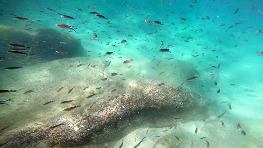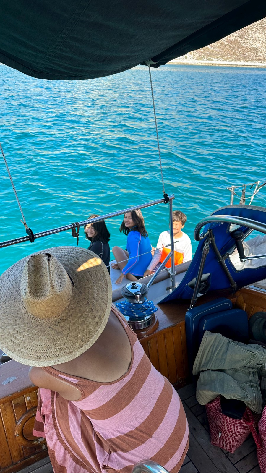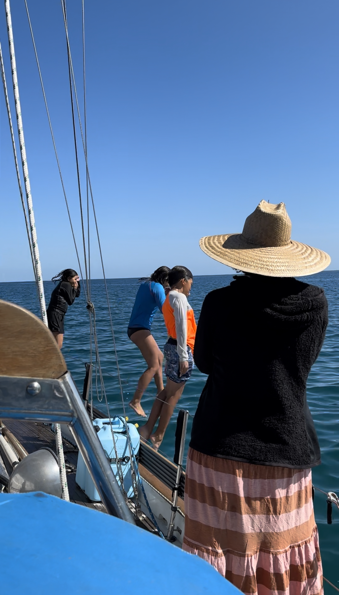 The main event of our stay at Frailes was getting the MaliMish family – who decided to come camp on this beach for another meetup – out to Meriwether. It took a couple trips back and forth in our tiny dinghy, but all five of them made it aboard Meriwether where we all set about having a great afternoon swinging from the halyards and generally playing in the water. It is the first time since we have owned this boat that it has been used for a day of fun and games. Heck, we even inflated our new-to-us swim platform, which turned out to be a whole lotta work.