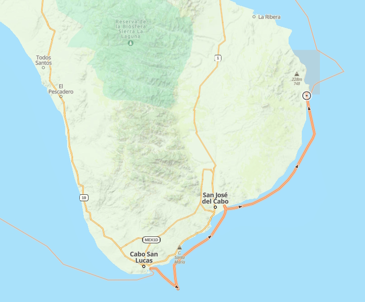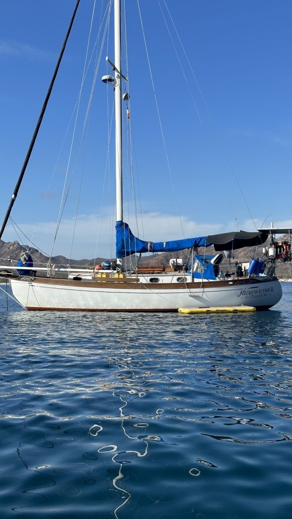 Sailing in 20+ knot winds was nice, but if you look closely at the map, we were still headed the wrong direction (south-east-ish) for two hours before we tacked and made the slightest amount of ground up the coast line. it wasn’t comfortable sailing, and we would take two days to get there beating against the wind. By the time we completed that second tack, we were hailed on the radio by an online-buddy-boat that had some of our mail since Ensenada, putting us out of our sailing-misery. Since they were arriving into San Jose del Cabo, and ha dour mail, we dumped the sails, turned on the engine, and aimed Meriwether to the marina. Once there, Kerri jumped from the boat, ran to their slip, grabbed the box, ran back, and jumped back on Meriwether all while I was circling in the marina to avoid paying the $140 USD fee the marina was demanding for a few minutes of dock use. With the mission accomplished, we were back on our way to Frailes, which took another seven hours of motoring. We arrived just after the sun had set.