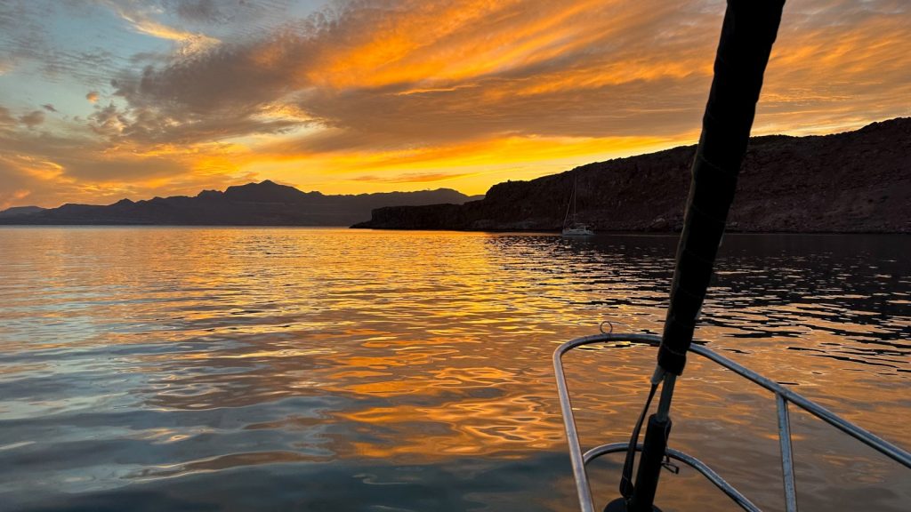 There were no expectations to sailing in the forecast, but within 15 minutes of lifting the anchor we had all the sails flying and the old diesel-donkey* was throttled down and turned off for the day. Sure, we would be headed into the wind, but we had all day to make a somewhat short hop to the next island to the north. What could have been a three hour donkey ride took 6+ hours by sail, but it was worth every second saved from hearing the all deafening clackity-clack. And 29.7 nautical miles later we were arriving to a crescent shaped bay on the south side of the island, already near full with other boats – most being chartered from La Paz. We dropped the hook and called it a day after [multiple, probably] cockpit cocktails and a sunset. Long days at sail make us take the easy way through what is left of the day, usually with the least amount of effort taken.