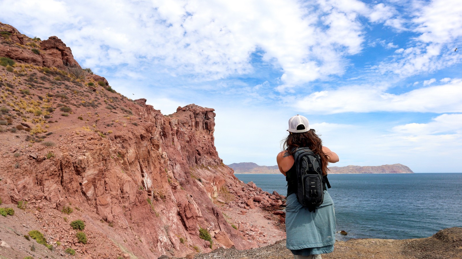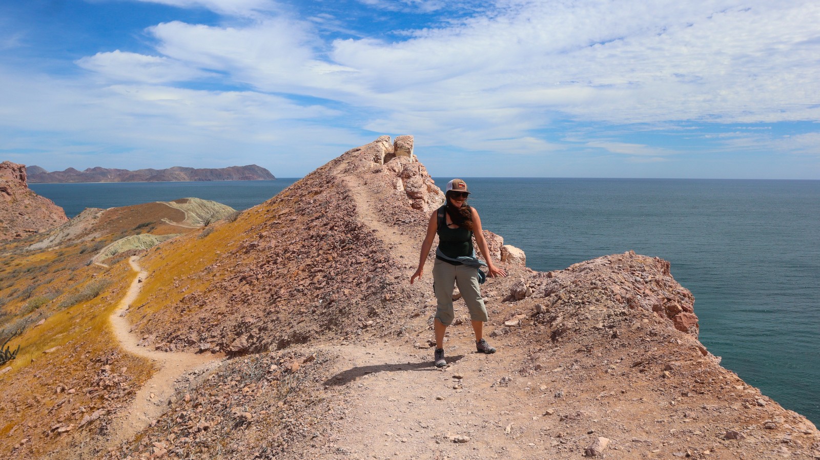 We did get up and off the boat the following day, this time for a proper hike. A trail was visible on shore, heading straight up the side of a hill, but it didn’t turn me off nonetheless. We hiked that trail. Well, as best we could with Kerri’s vertigo and the quite hefty breeze shoving us around up at the top of the hillside. It was a pleasant – minus that part that went straight up – hike up and around to the back side of the island then back down into the dried up lake bed slash salt flats area.