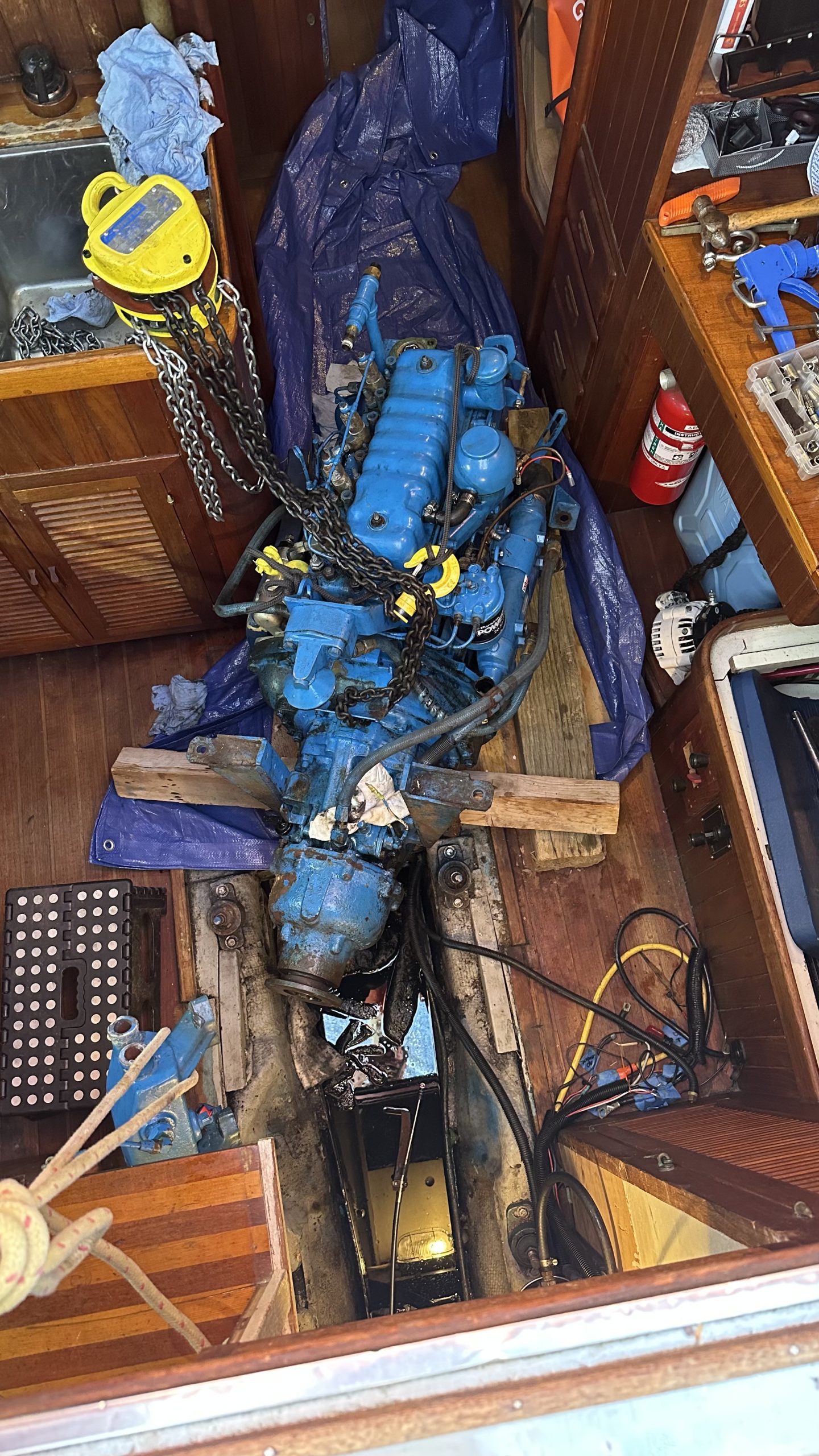 Nevertheless, after sourcing a hoist, and with some friendly boat-neighbor spectators (who also helped), we pulled the old donkey out from its living space under the companionway and plopped it right in the galley. Here is where it would reside while I dealt with cleaning and painting the bilge, a rear transmission seal, and numerous engine gaskets. This, all in an attempt to get a notoriously leaky brand of motor to stop puking itself into our bilge. I know it is futile, but maybe I can slow it down? Time will tell.