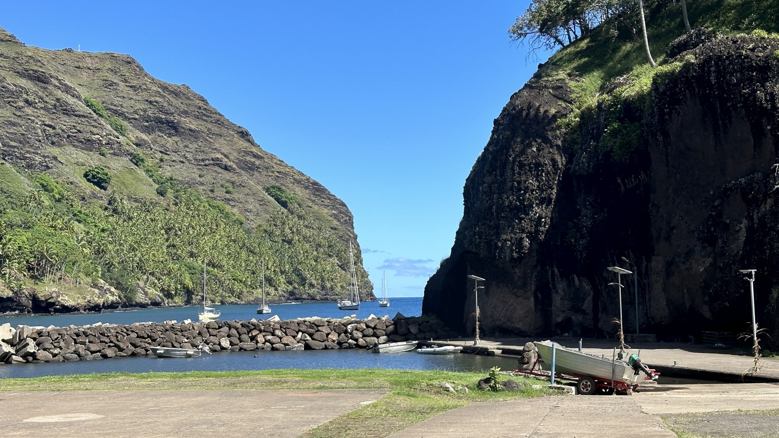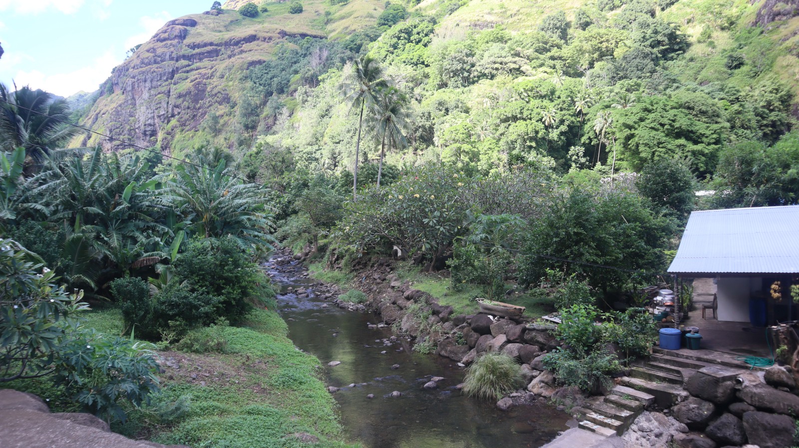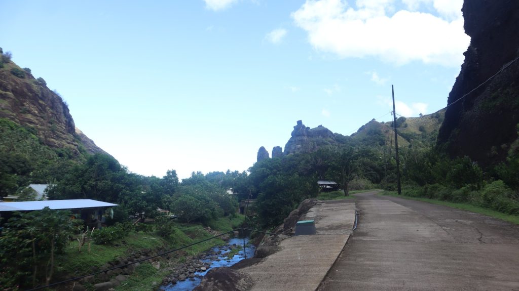 The village of Hanavave is so idyllic it made me want to live there. A short paved road out of town which paralleled the river leading from the mountains to the sea, where both lined with small shacks of varying degrees of standing and falling. All were heavily forested. Some had some small livestock, chickens, or vegetable gardens. Some you had to cross the river to enter the front door. It was a Sunday that we first came ashore and the small church was full of singing churchgoers as we walked past for a quick trip to the local store. Alas they did not have eggs or baguettes at the time we arrived, the two items we were desperate for. One pretty much needs to be at the store at 7am to get either of those, so the next morning I set out early on my own. Eggs would be another day away, but I scored baguettes and a popsicle on both trips so all was good.