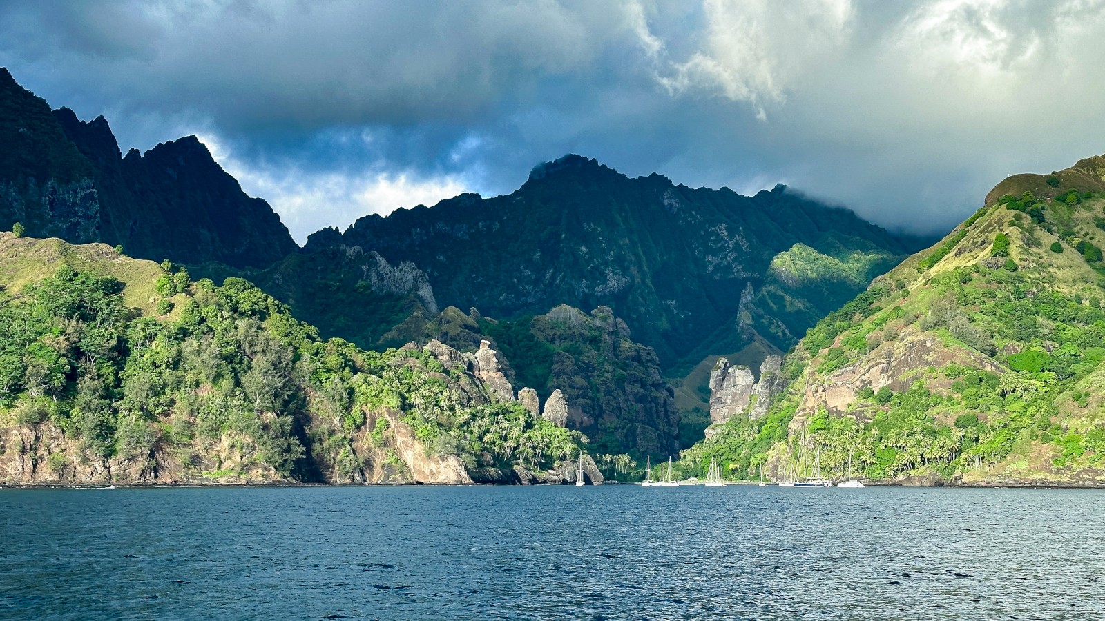 When that wind shift took place two days later we got up dark-early and hauled up our anchor and pointed Meriwether South-West towards Fatu Hiva, some 45 nautical miles away. The wind had shifted just 10 or so degrees on this day, giving us the opportunity to close-haul sail the full 9 hours, in light winds. It was a welcomed change of pace from the weeks long down-wind sailing of our passage. Meriwether rolls a lot in down-wind sailing, and hardly at all when the wind is forward of the beam.