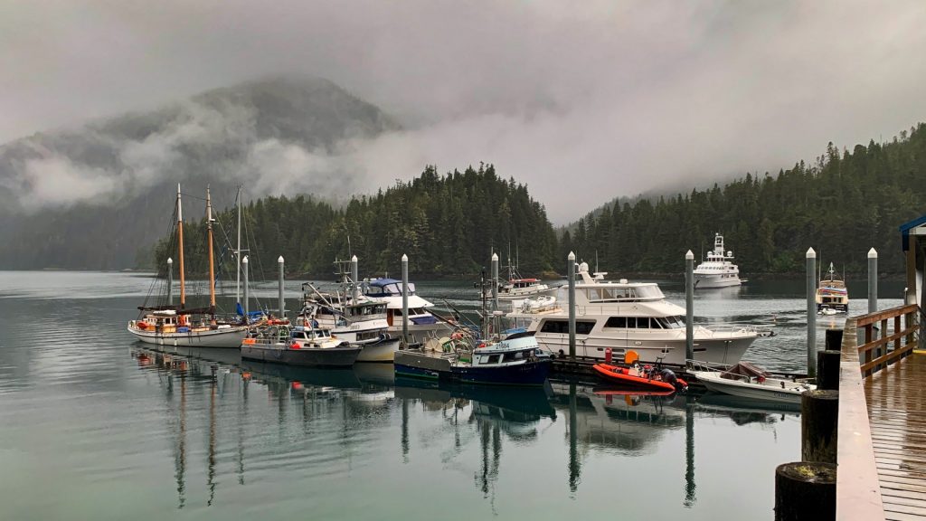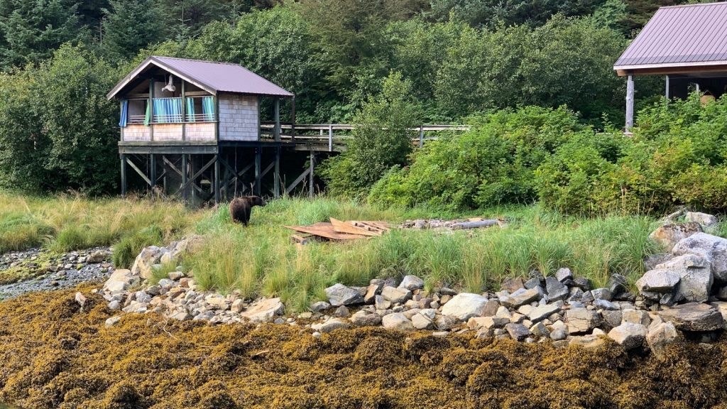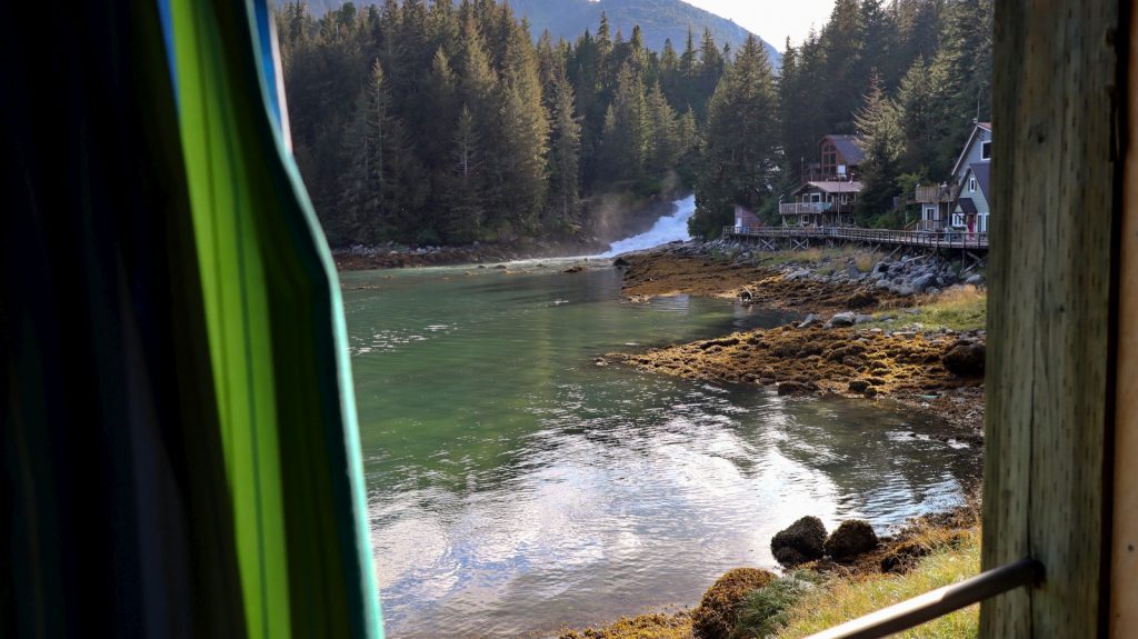 As if this scene wasn’t unreal enough on its own, it’s taken from the viewing window in our free private hot springs bathhouse room. We tied up to the dock at Baranof Warm Springs, got situated, and immediately packed up to head to the public bath house, with three private rooms overlooking the cove and waterfall, each with a huge bath tub that pipes in hot and cold spring water that you can control to your liking. As we headed up the dock toward the ramp, we were waylaid by a brown bear a little to close to the boardwalk and bathhouse for comfort. We waited a while for him to meander on, and found that the view from our bathhouse room look down upon the waterfall and bear, who remained for our entire soak.
