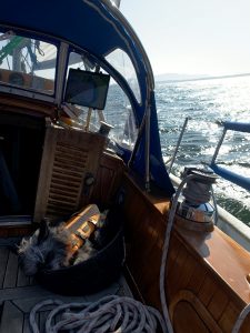Our sail that afternoon was only an hour and a half. We only planned to return to Inati Bay for an undetermined number of days as a shakedown. As has been true for the entire time we have been in Bellingham, the wind was coming from the exact direction we want to travel. To get there, to our first destination as full-time sailors, we planned a route That included two tacks. The first tack put us nearly on a 120 degree heading (away from our destination) thanks to a wind shift, but the second pointed us right at our target. We were close-hauled the entire time, which meant we were heeled over at 20 degrees. It’s an exciting way to sail – looks cool – but not really the most comfortable. Kerri seems to really enjoy it though. Moose, not so much.