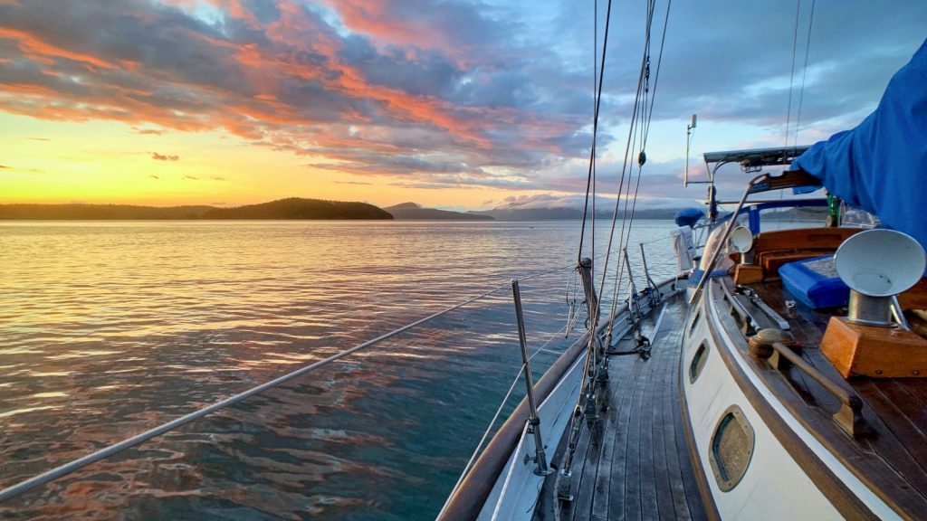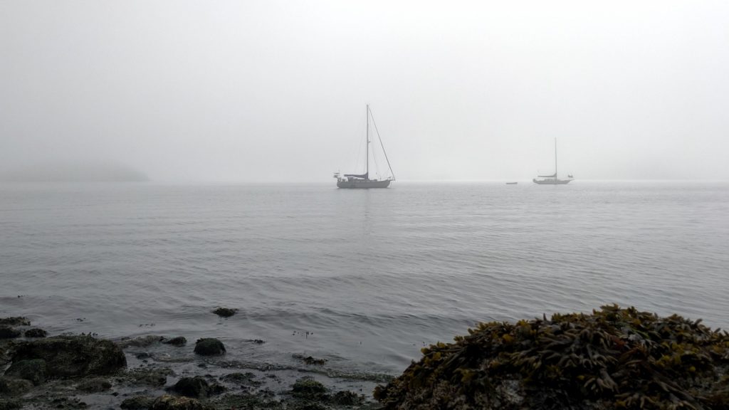 We even got our first foggy morning since taking to this sea-life. Personally I thought we would have so many more than this, but I can’t complain. I’m not ready to start sailing in the fog. Motoring our little dinghy to shore with Moose in the fog? Easy – peasy. And in the evenings we were rewarded with some spectacular sunsets.