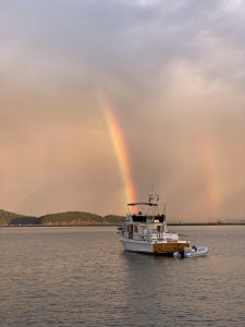 Spencer Spit State Park is where we came too. It wasn’t the most scenic place or the most protected from the wind, but we would have trails to explore and a peaceful work week on the water. We were the first boat to anchor in the bay – the others there before us taking up the mooring balls. I had thought we anchored far enough away to avoid being cramped in by later arrivals, but not so much. The name of the game seemed to be how close to the bow of Meriwether can one anchor without causing an actual collision. It all seemed so unnecessary, but whatever. When Kerri talked to one of the close-neighbors about the epic rainbow coming to a conclusion on his boat, his only response was simply “I’m from Canada!”