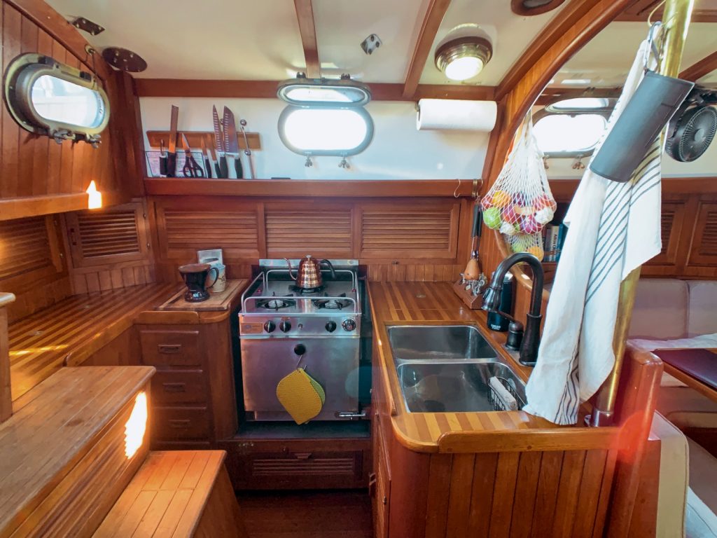 Sailboats are usually designed with a tight, enclosed area for cooking so that the cook will have places to lean against and steady his/herself while cooking underway. The galley still has the original 40-year-old Shipmate gas range. It’s a workhorse, and also has a double broiler—I haven’t had a broiler in over 8 years!