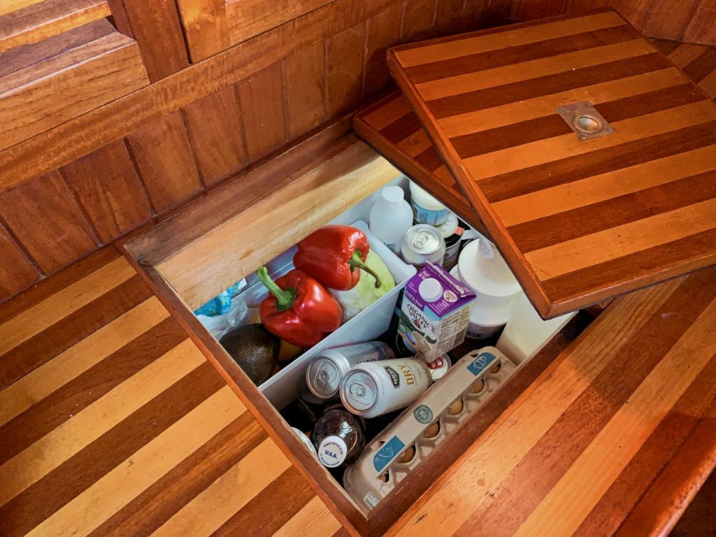 When we bought the boat, it still had the original icebox, which we converted to a fridge. It’s incredibly efficient, as these old ice boxes were built with inches and inches of insulation.