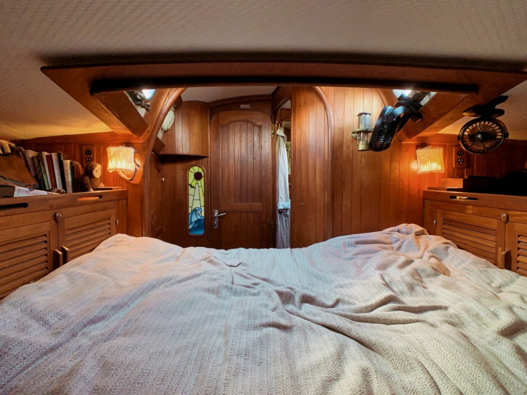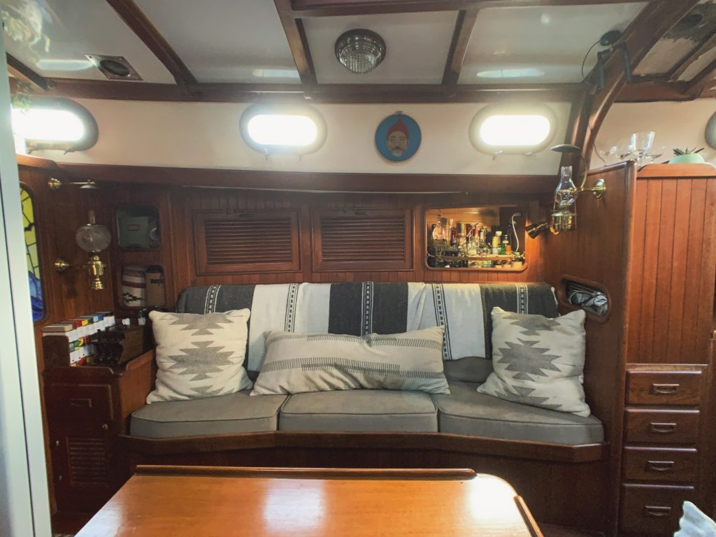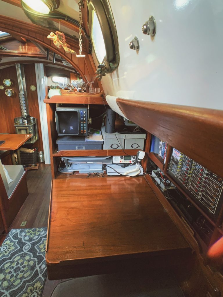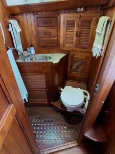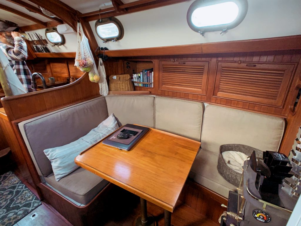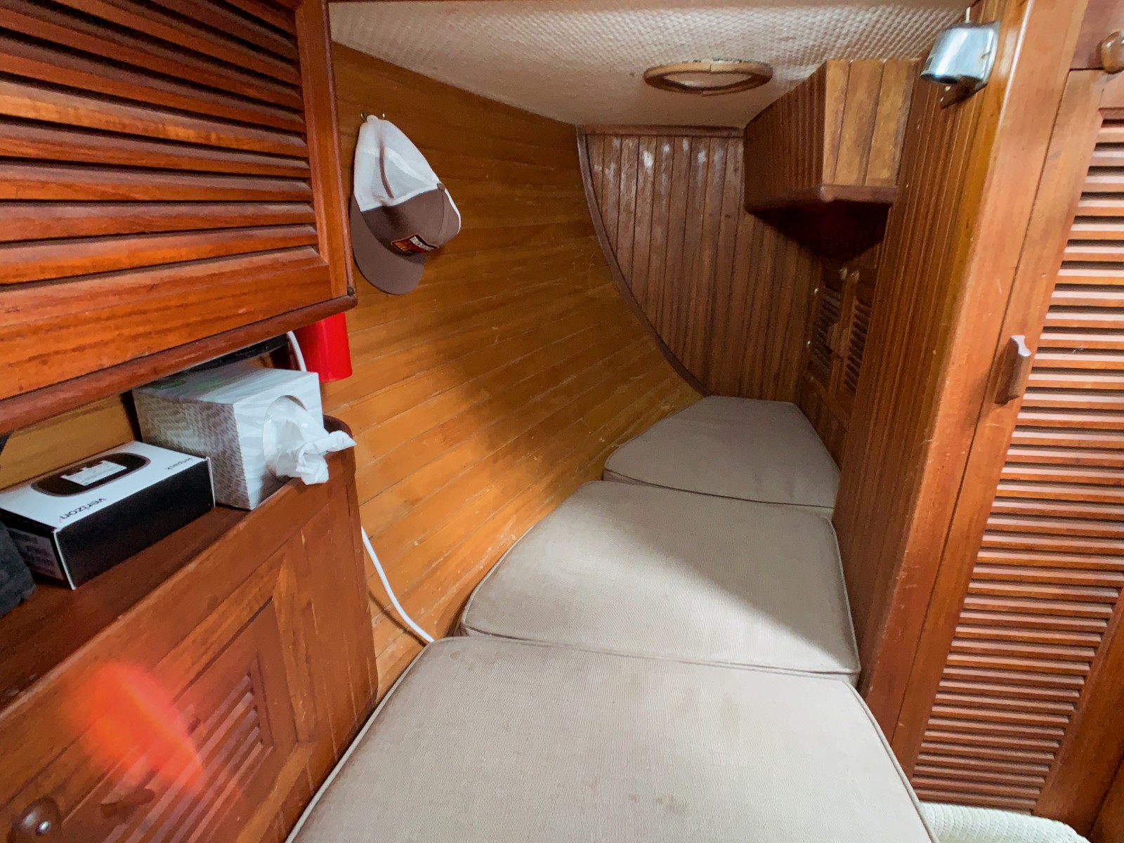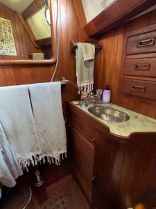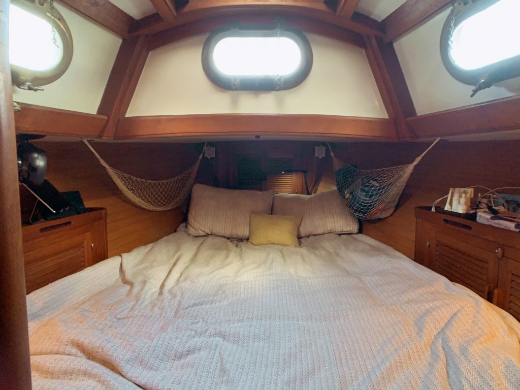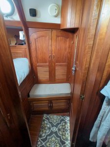 What would be called the “stateroom” if this were a bigger, statelier boat with a bigger “master suite”. Our primary sleeping area is the V-berth, so called because of its shape created from being in the bow of the boat. One of the things that sold us on this Baba was how roomy it felt compared to other v-berths. It’s standard to sleep with your heads face aft — out — on the wider side. But we find it more comfortable, and have plenty of space, to sleep with our heads forward in the crook of the V. The head (bathroom/toilet) door swings open to become a door closing off the area. There’s a good sized hanging locker (closet), and a small bench (that bench really sold me on this boat, too, for some reason).