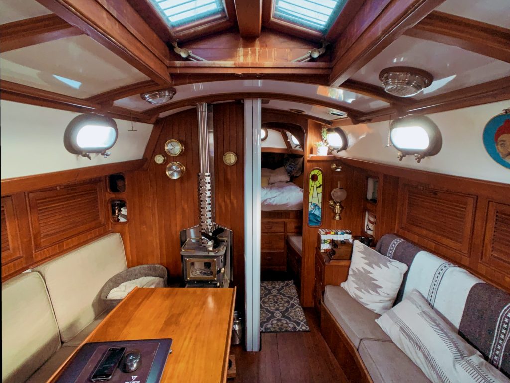 We removed and old fussy diesel heater added a @cubicminiwoodstoves in early summer. Our approx. 75 gallons of fresh water tanks are under all of these benches. Unfinished projects visible: Leaky butterfly hatch (the skylight that opens).
