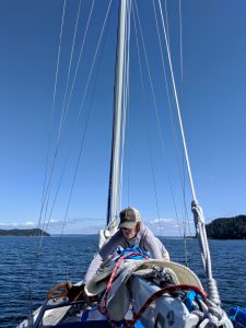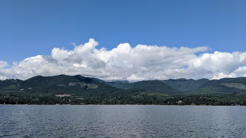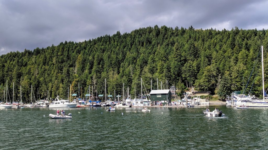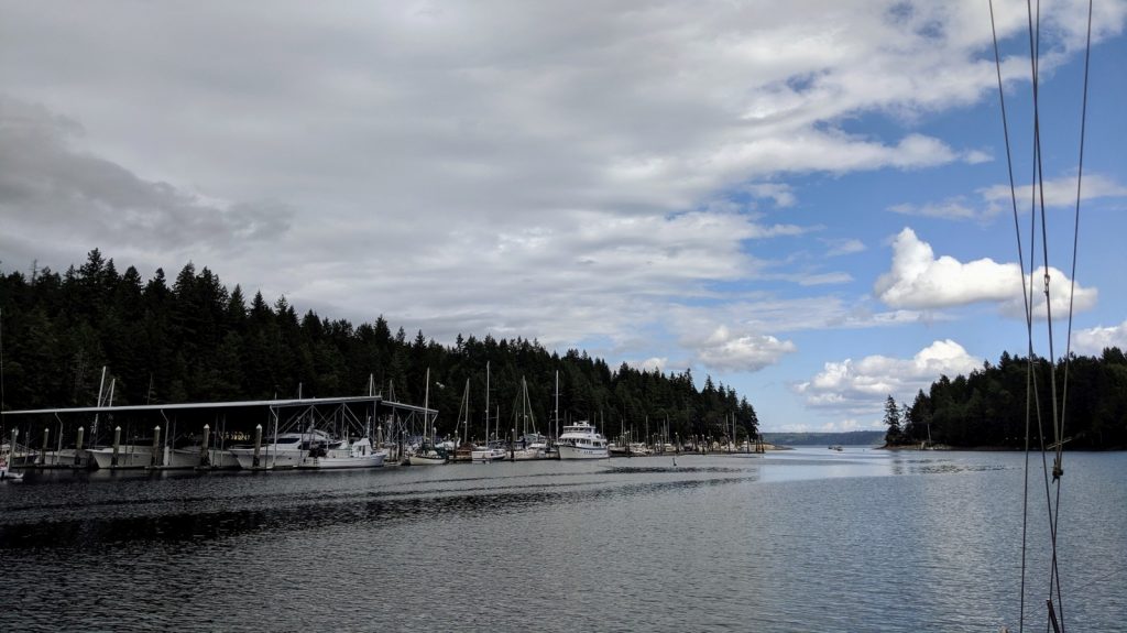 There was only one way to go now – North, back up the Hood Canal. It took us two long days of travel to get all the way down here, and we would have two long ones to make the return voyage. After another stop at Potlatch State Park for a final shower, we were back on the water for a 22 nautical mile back up Hood Canal. At least the wind was not scheduled to blow directly in our face during the trip. In fact, it turned out not to blow much at all, so we motored for seven-plus hours for the day – our longest stretch of motoring to date. We were tempted to raise the main sail once, but it was stacked and packed away again pretty quickly as the wind didn’t justify it up. Good practice in the end. Unfortunately, this long stretch of motoring has put us over 50% of our travel-time on the motor. We really prefer to sail, but we have heard a 50/50 is normal for the Puget Sound where the wind is unable to run free thanks to all the islands and landmasses around.