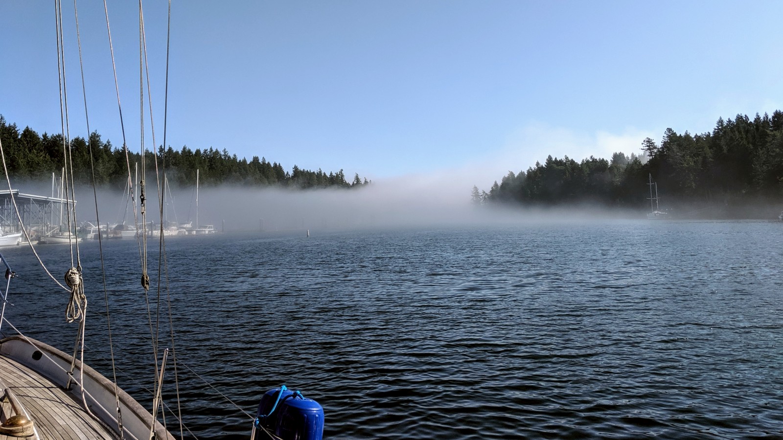 Looking back at Pleasant Harbor you can see all the motor boats starting to stream out of the bank of fog.