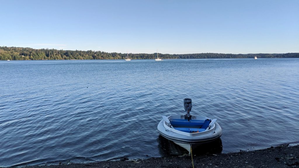 With the turn – now facing 90 degrees to the wind – we could have raised our sails, but our final destination was less than 30 minutes away. Lazy, we just kept motoring to and through the channel markers and into Port Gamble Bay. It was easy to spot where the preferred location is for anchoring by the masses as there were numerous boats there. We steered away from it, choosing the other side of the bay to anchor where we would have it all to ourselves. Which we did. For a while. After a successful anchor on our first attempt (yea that’s right, we are pros at this again) another sailboat pulled in beside us an hour later. Not long after that a small tug pulled in on our other side. So much for solitude.