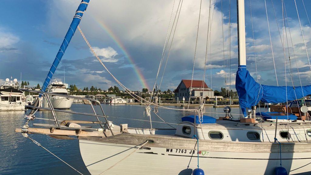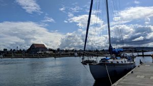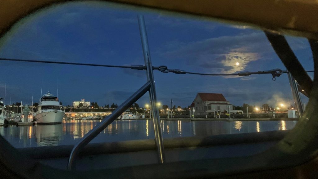 On a calm morning we moved Meriwether to the north guest docks in Everett Marina to use the pump-out. There is even a small park on this side of the marina. Moose would surely enjoy some grass and bushes during his walks. We also had better access to the restaurant and distillery that we wanted to visit during the week. Allow me to emphasize the distillery. It was also a much prettier part of the marina – being newly built and all – to call home for the remainder of our stay.