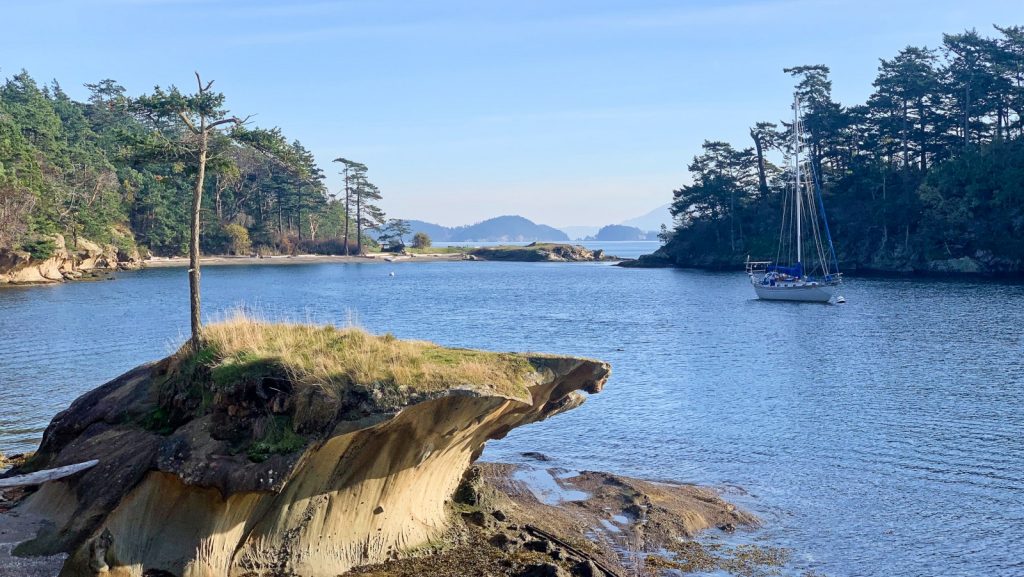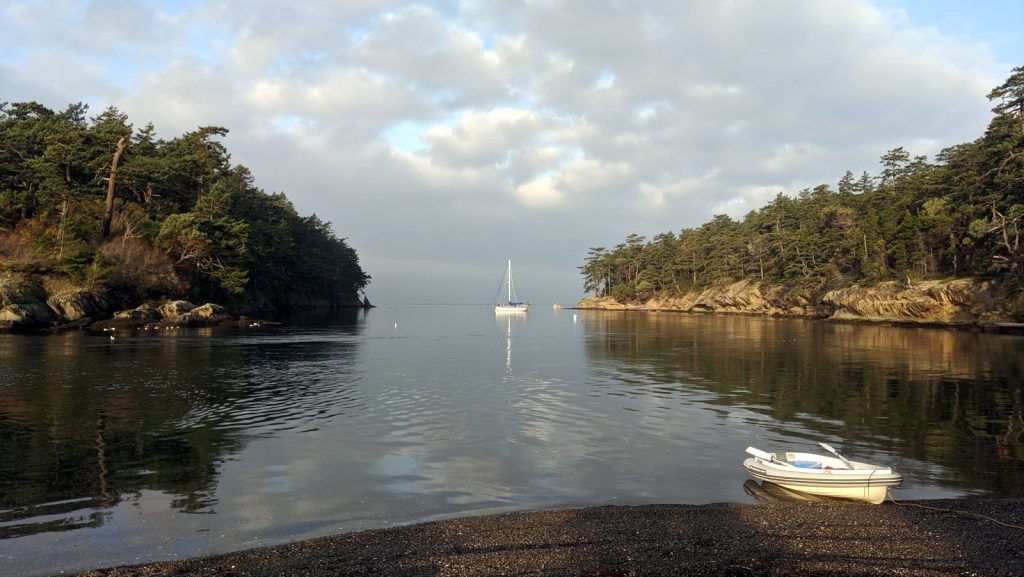 Patos Island is only a few miles away from our last stop. Barely enough time to raise the sails. Not that we had any wind anyway, so the decision was already made for us to motor over. At least the alternator will charge our house battery during the two hours (we cruised it, nice and slow). We even took the long way around the island to avoid some heavier current flows on the other side. We had time, so why not. It wasn’t very exciting – motoring never is – but we made the best of it. Finally, just as we started around the final corner to turn into our cove, something to our starboard caught my eye…