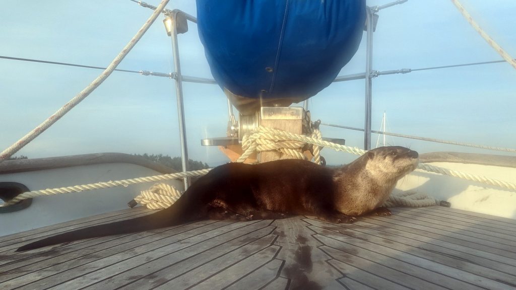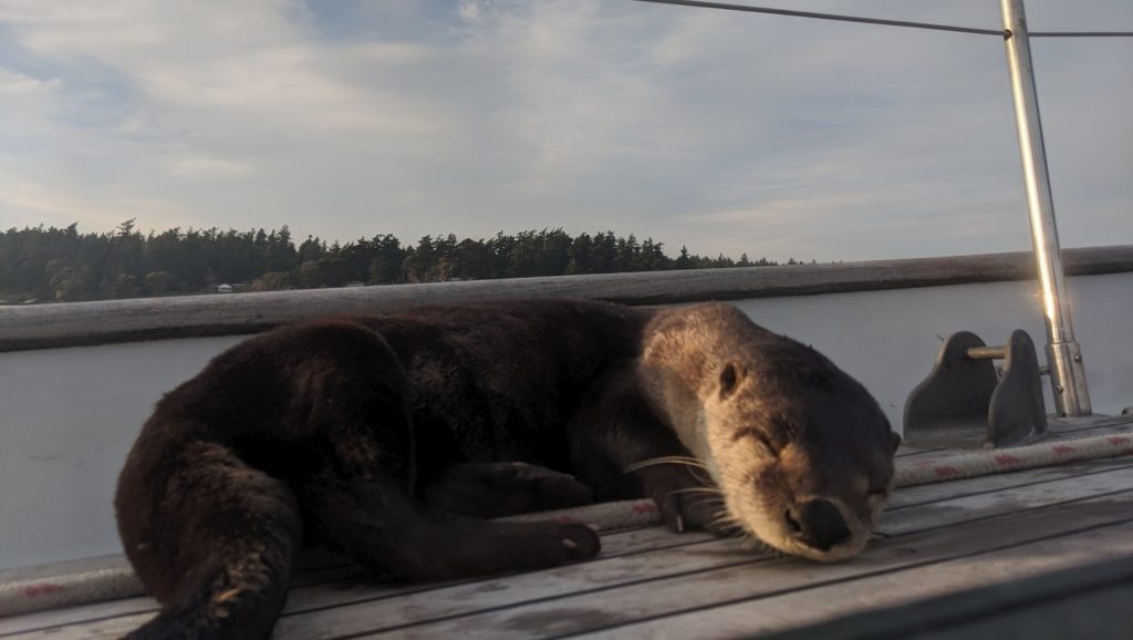 Fisherman’s Bay tuned out to be an uninspiring place to spend the week. We had to anchor so far from shore, and the place I could most easily get to shore was road-side. Moose didn’t have much room to do his business, and traffic was much heavier then you’d expect for the back side of some random island. The only real exciting thing that happened all week was being boarded by a sea otter who thought Meriwether’s teak deck was the most amazing thing (I happen to agree). She slithered and rolled herself all over the deck while we watched, and photographed, through the port-lights.