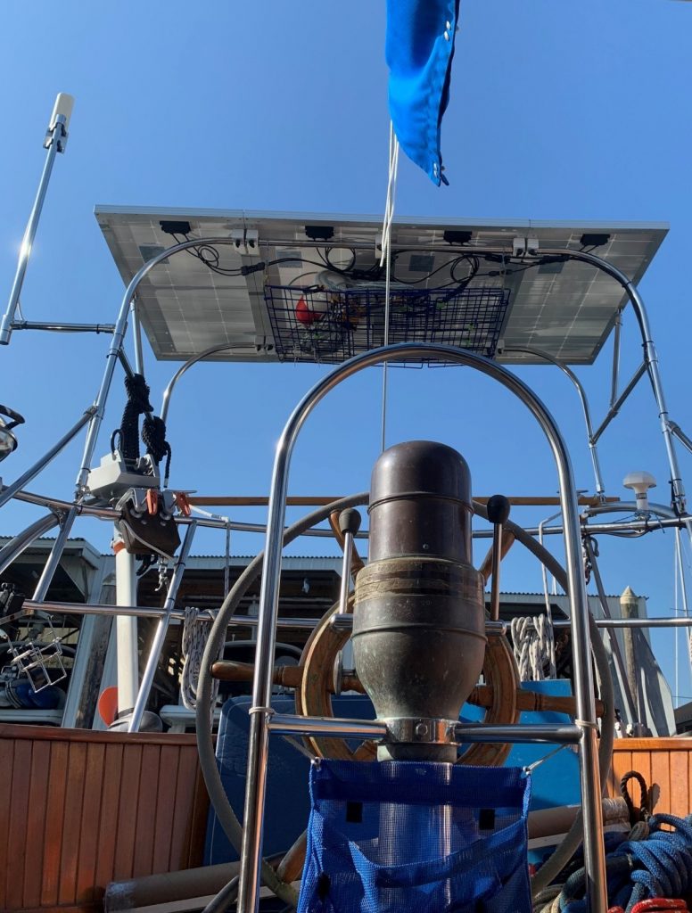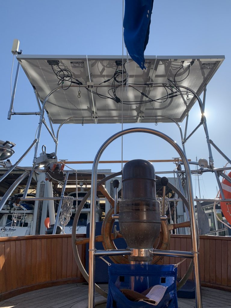More power! {insert Tim Allen grunt here} That is what we needed – more solar power. Over the winter Kerri found some 200 watt solar panels to replace our 100 watt panels. She found that these three 200 watt panels would take up nearly the same space as our four 100 watt panels. Only a few inches longer (more shade in the cockpit) it would bring our solar array up to 600 watts… a 50% increase. It was an all day process (meaning four to five hours), but we got the old panels removed and the new ones installed the day after they showed up at our broker’s office.