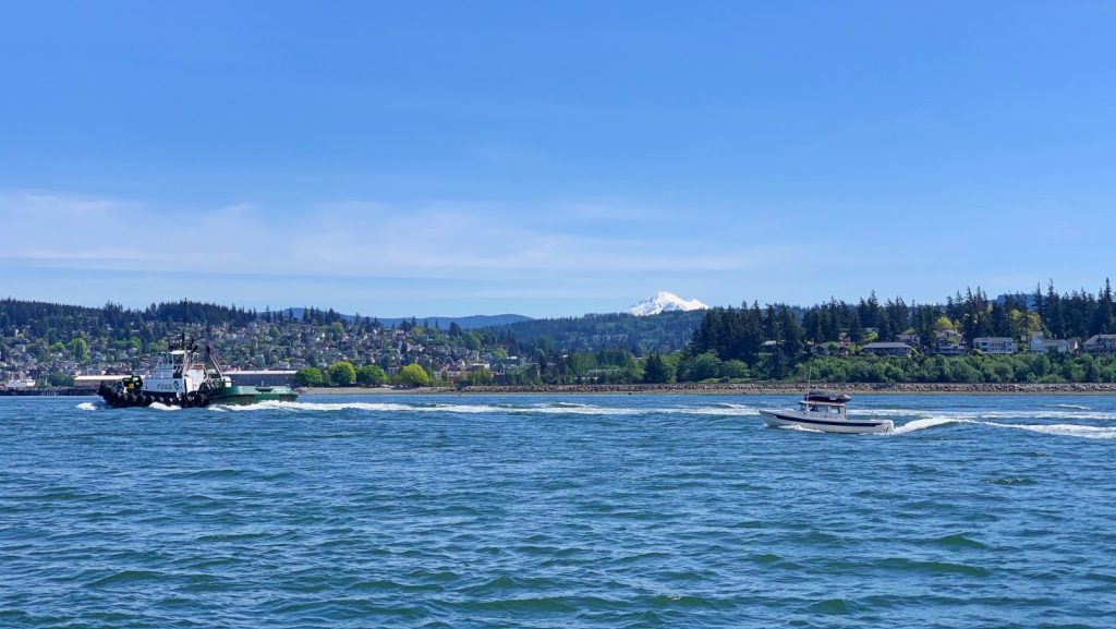 A gentle breeze from the North West allowed us to sail at a beam reach (wind coming directly across our boat) for a while. Meriwether eased herself up to 6+ knots of speed (did I mention we fixed our speedometer just a few days prior?), passing other sailors along side us (it is always a competition). We were far from being alone on the water that day, with multiple other sail boats within a quarter mile heading the same direction as us. For the first time in a long time we had to think about the right-of-way rules, which we did not have. Adding to it, numerous motor boats were zipping in and out of our bubble of navigable water, and although we do have the right of way over them while under sail, they still required a watchful eye to ensure things went as they should. We navigated all the traffic and altered our heading to the opening of Chuckanut Bay. This put us on a nice down-wind sail as the winds calmed. We just puttered along, in no rush, towards our destination.