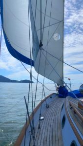 A gentle breeze from the North West allowed us to sail at a beam reach (wind coming directly across our boat) for a while. Meriwether eased herself up to 6+ knots of speed (did I mention we fixed our speedometer just a few days prior?), passing other sailors along side us (it is always a competition). We were far from being alone on the water that day, with multiple other sail boats within a quarter mile heading the same direction as us. For the first time in a long time we had to think about the right-of-way rules, which we did not have. Adding to it, numerous motor boats were zipping in and out of our bubble of navigable water, and although we do have the right of way over them while under sail, they still required a watchful eye to ensure things went as they should. We navigated all the traffic and altered our heading to the opening of Chuckanut Bay. This put us on a nice down-wind sail as the winds calmed. We just puttered along, in no rush, towards our destination.