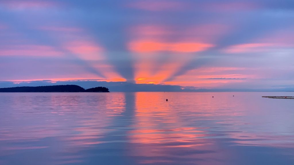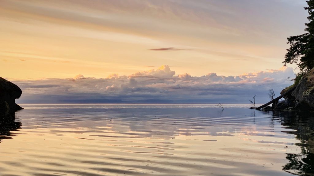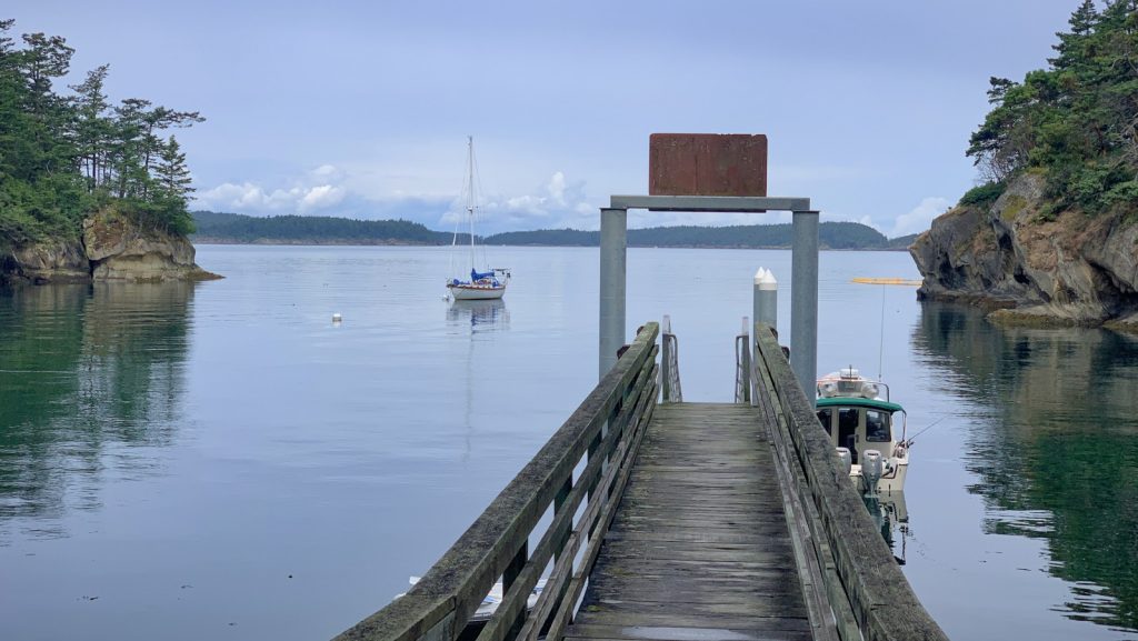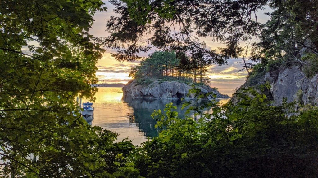 We arrived to an empty bay and selected the mooring ball furthest from the dock as we were uncertain about the depths close to shore. This proved to be unwarranted, as other boats larger than ours would use the dock in the coming days. Still, within a few hours the bay was full again, but we had the unobstructed view out the bay, looking back at Sucia Island and the sunset. We are getting better at this. After the work day and the obligatory happy hour, we dropped ourselves into the dinghy and went ashore to register again, and instantly fell for this little island. While the internet wasn’t all that much better, the scenery was. Because of the quite small bay, it was very intimate. The birds, which there we many, surrounded and sung for us. And other than the occasional motor boat speeding past, it was exceptionally peaceful.