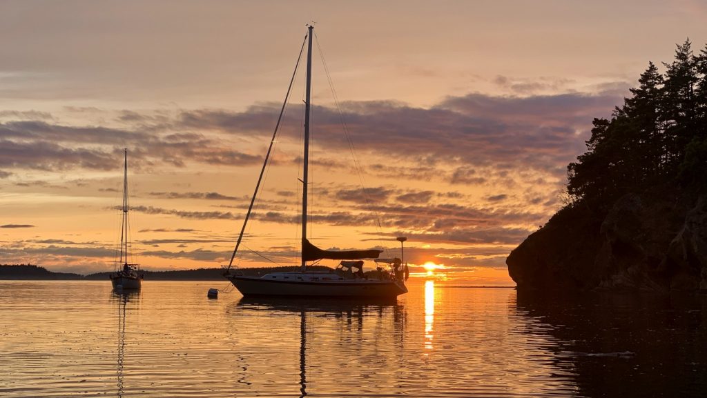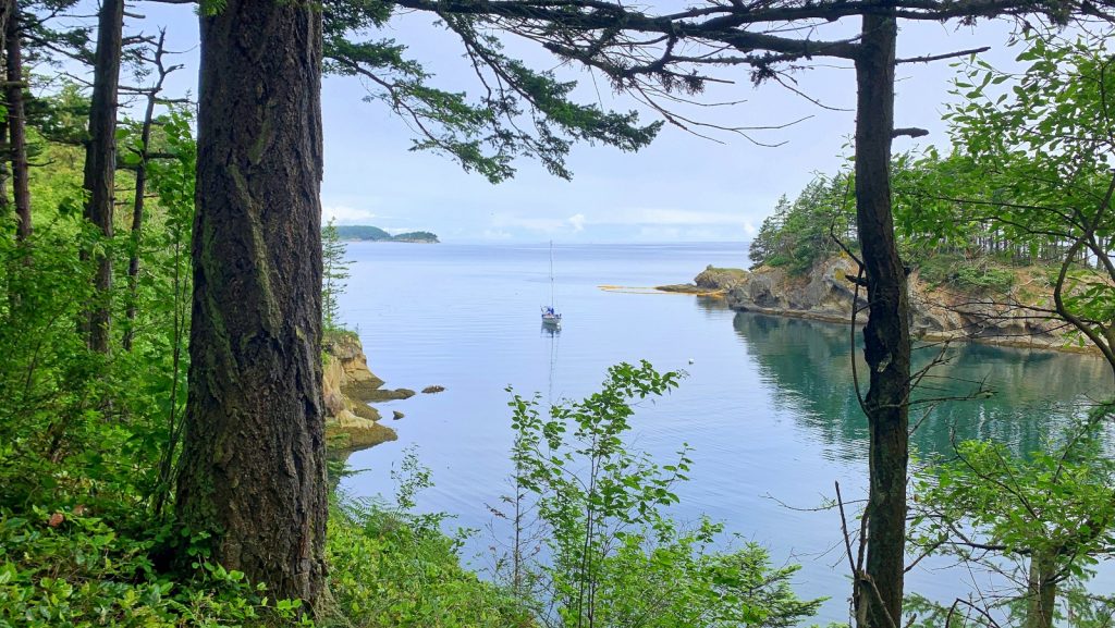 Unfortunately, after 20 miles of sailing, the small anchorage at Matia proved to be full. The anchorage comprised of only two mooring balls and a dock – and we don’t like docks. We motored on – the wind having just died off – to the next island – Sucia Island – which we have visited a few times in 2019. We arrived not long before sunset in Shallow Bay on the north side of the island. We dropped the dinghy and went ashore only to register for our few night stay on the mooring ball, and let the weather pass us by. After two nights, we tired of the poor internet there and decided to move to the other side of the island, with the option of Matia if the anchorage was open, as our route would allow us a view into the bay. Kerri continuing working in the cabin while I motored us – a first for us – around Sucia . At half distance I got my first view of the bay on Matia, and knew that was our next destination.