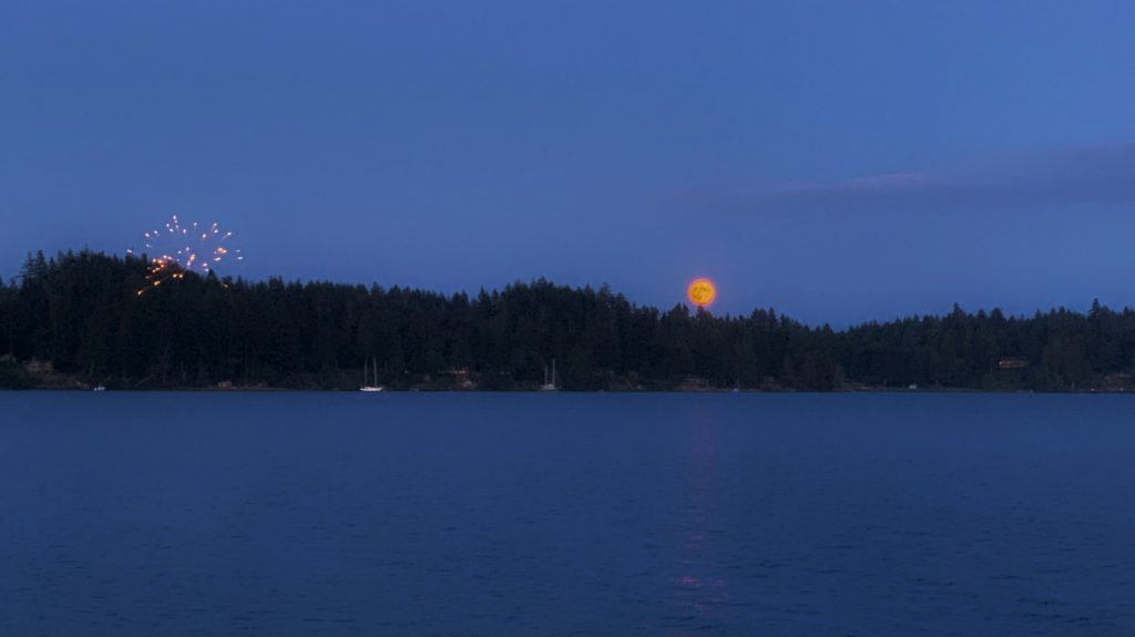 Fourth of July came and went while we were anchored here. Surrounded by the Port Gamble S’Klallam Tribe tribal land, neither of us expected a whole lot of ‘Merica celebrations, but there was some serious fire-works to be seen that night. Ironically, only [people of] reservation land had the ‘freedom’ to use personally owned fireworks in the state of Washington. The ‘American’ part of the state was forbidden by law from using (or possessing) any such fireworks. What ever… the moon kicked major ass that night anyway.
