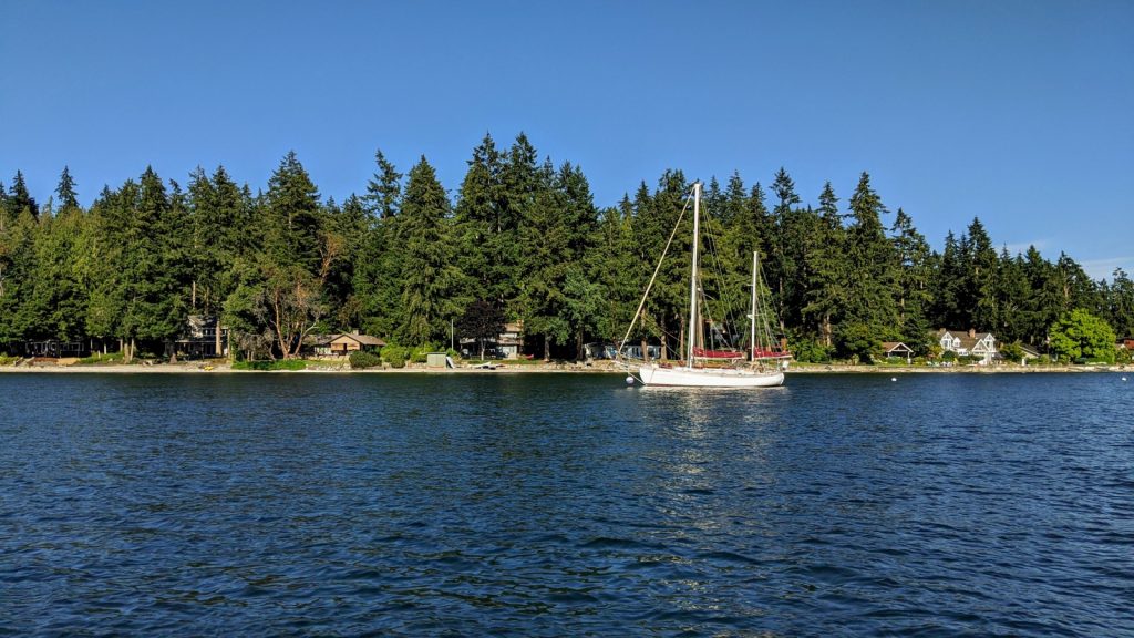 While docked at Port Townsend last August, only two months into our sailing lives, we met John and Kate on their beautiful 43 foot Hans Christian, Stardust. The Hans Christian is a second-cousin to our Baba. Not directly related but you can see a lot of similarities thanks to good genes in the early line of Hans’ which was a direct relation. After hanging out with them for an evening, we were invited to their place any time we were in the south Sound. So when we started south, John made sure to contact us and arrange a weekend to drop in, which perfectly aligned with our route directly past his place – unbeknownst to me when I planned our route. Their place was only a few short miles from our last week-long anchorage of Dyes Inlet, and with the fickle wind that day playing ‘puget-sound-nice’ as usual, we motored into the small bay where Startdust was sitting pretty on a mooring ball. John came out to meet us on his stand up board to show us a good place to drop anchor. Taking his advice we set the hook and got to finishing up some chores before our evening socializing.