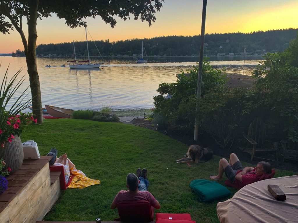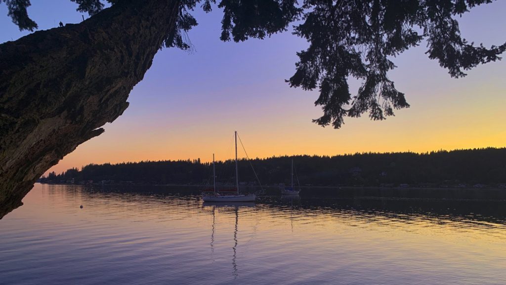 Two nights we spent hanging out with these two great people, while keeping socially distanced of course. We ate BBQ chicken meal one night and Pizza the next (I did say they were my kind of people, right?) while we sat out on their patio overlooking Stardust and Meriwether together in the small cove. Drinks and stories ensued for hours, well past the very late sunsets up here at this time of the year. We even spent one night at the fire pit for some s’mores. The weather, for once, was perfect for sitting out after the sun dropped and we took full advantage of it. Ah, it was good to see these two. Hopefully our plans coincide in a few more months to sail with them back up near the islands.