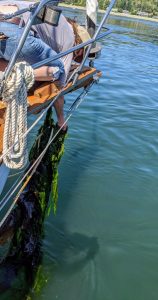 After our two night stay we were set to move on for the work week. As we started pulling up anchor we were attacked by the seaweed monster again. The chain, a hundred feet of it, was completely tangled with seaweed which Kerri tried her best to clear while I sat back and took some photos of the struggle. Eventually we would get the chain up, but the smell would come back to plague us within 48 hours. So many small bits of drying – now decomposing – seaweed were still tangled in the chain links, which go into a locker right at the head of our bed. We realized our mistake on the first night after, and by the second night we were in serious trouble. I would be forced to pull all 220 feet of chain up on deck, clean out the anchor-chain locker, and hose down each individual link in the chain to clear it of any leftover seaweed. It was hours of work, but the payoff was worth it; no gross bottom-of-the-sea smell at our pillows.