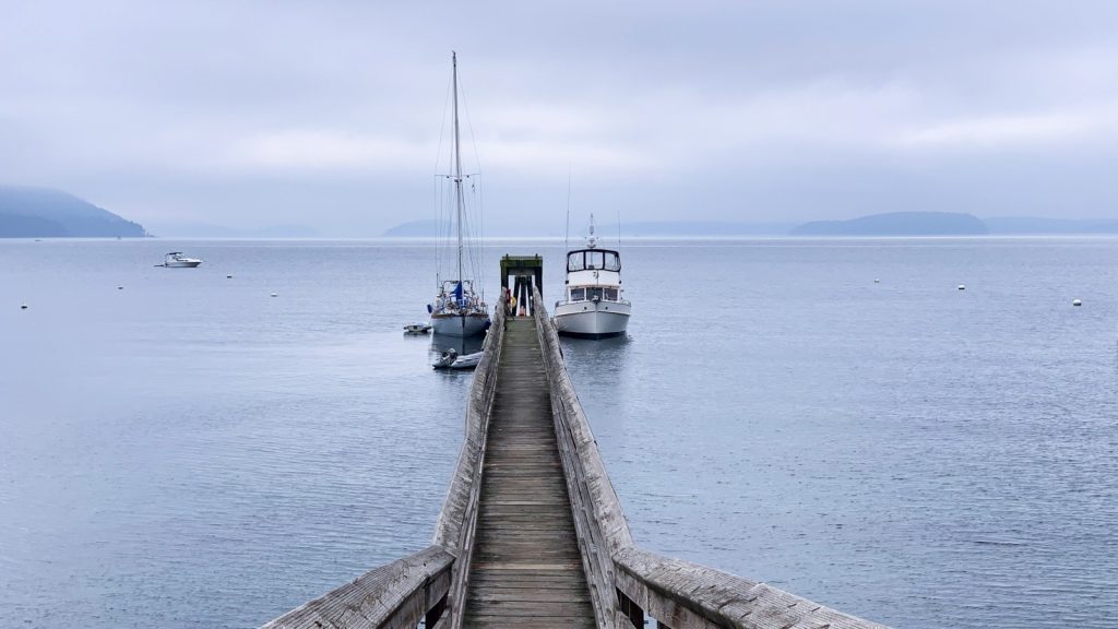 The sail, although taking twice the time over motoring, was perfect and we wanted the hours of sailing on our resume. It didn’t take long for us both to agree that it was the right decision – to sail. Life at sea is so much more pleasant with the motor off and the sails dancing in the breeze. We tried a few sail-trim ideas and practiced a heave-to which we hadn’t done in a long time. It was a productive day on the water. Calm and steady winds pulled us up East Sound towards Madrona Point, where a city dock awaited our arrival. Not to tie up too – we prefer to anchor – but to use for a provisioning trip into town.