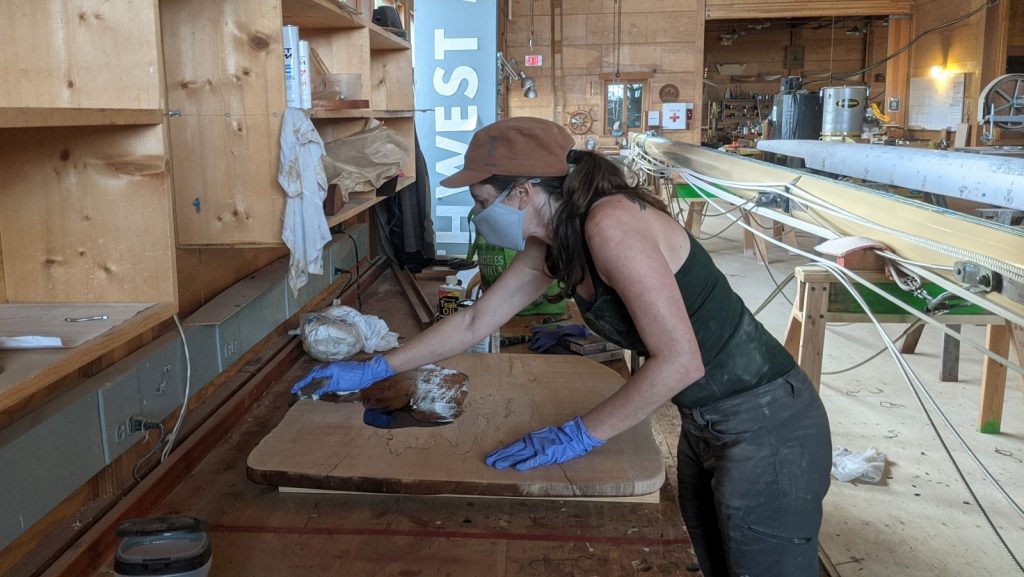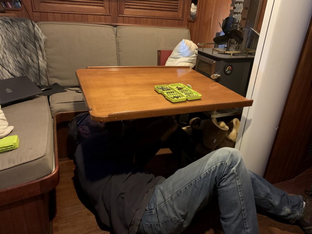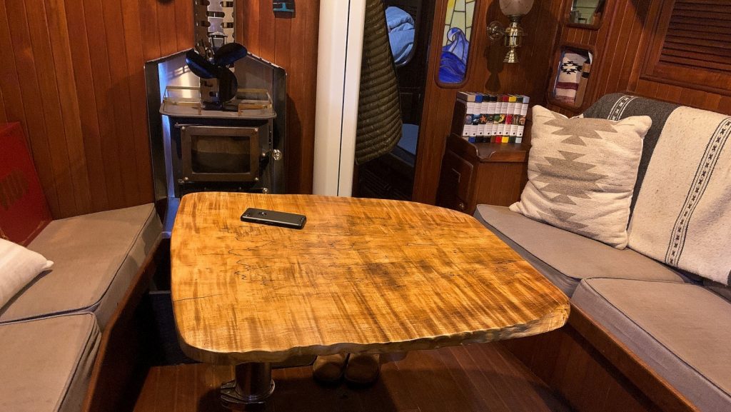 The big wood-project of the month was our new dinette table. We had finally sourced a new table pedestal (from overseas, of course) and found an amazing piece of locally grown and felled wood in a shop only a block away from the marina. Two weeks of chopping, sanding, staining, and spraying and our new table – a project that started in 2019 when we installed the wood stove – is finally done. The pedestal allows us to raise, lower, spin the table as well as slide it left, right, fore, and aft within the saloon area which allows us so many uses. We got straight to using it to it’s fullest with a fire warmed movie night in coffee-table-mode!