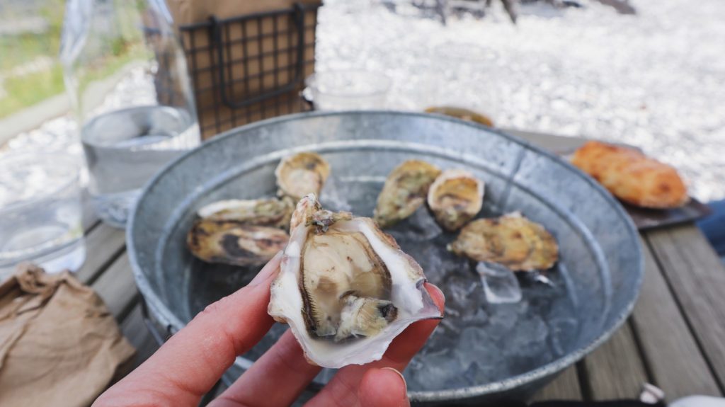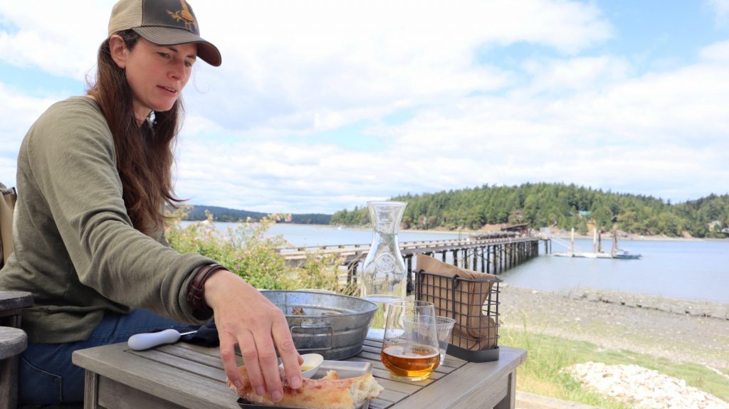 Thursday morning we motored the less-than-one-mile to the neighboring bay; Wescott Bay. Yes, we have been here before too, but this time the Wescott Bay Shellfish Company was open for business (outside dining). Last year, thanks to COVID 19, they were only taking takeout orders and delivering them to the dinghy dock for pickup only (which was cool, but we were here when they were closed). This time around we were able to go ashore and enjoy an oyster-slurping lunch while overlooking Meriwether dancing around at anchor the bay.