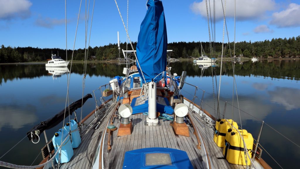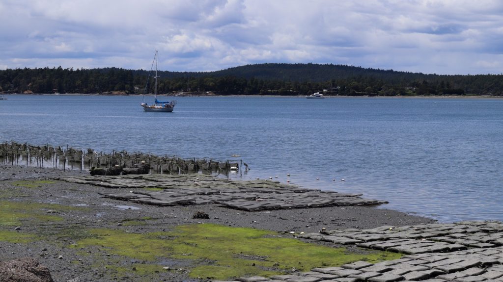 On the same island as Friday Harbor, Garrison Bay would take only 13 miles of sailing to get us there – most of which was fine (easy, relaxing, un-stressful) sailing with a dash of motoring to finish off the job. With the weather on the drizzly side, not many other boats were on the water this day, making it even more relaxing. As the three hours progressed, the wind slowly died off and the blue sky would peak out from the clouds from time to time, pretty much clearing off all together by the time we arrived. Clear, sunny, dry weather would be our forecast for the remainder of the week as well. Surprisingly, there were a lot more boats at anchor in Garrison than we had experienced in the past, but they did leave our favorite spot open just for us; closest to the public dock. Once the tide went out the following morning, our depth instrument showed we had less than a half-foot of water between our keel and the mud. We couldn’t have anchored any closer to shore, that is for sure.