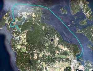 On the same island as Friday Harbor, Garrison Bay would take only 13 miles of sailing to get us there – most of which was fine (easy, relaxing, un-stressful) sailing with a dash of motoring to finish off the job. With the weather on the drizzly side, not many other boats were on the water this day, making it even more relaxing. As the three hours progressed, the wind slowly died off and the blue sky would peak out from the clouds from time to time, pretty much clearing off all together by the time we arrived. Clear, sunny, dry weather would be our forecast for the remainder of the week as well. Surprisingly, there were a lot more boats at anchor in Garrison than we had experienced in the past, but they did leave our favorite spot open just for us; closest to the public dock. Once the tide went out the following morning, our depth instrument showed we had less than a half-foot of water between our keel and the mud. We couldn’t have anchored any closer to shore, that is for sure.
