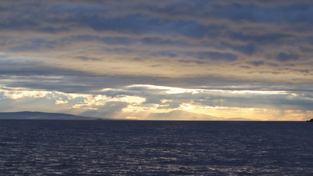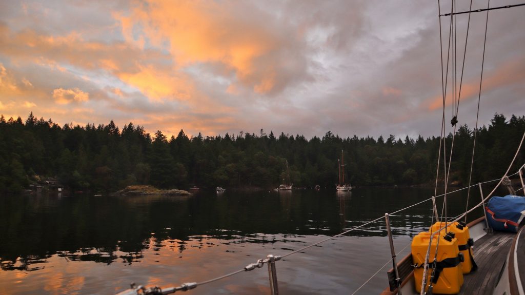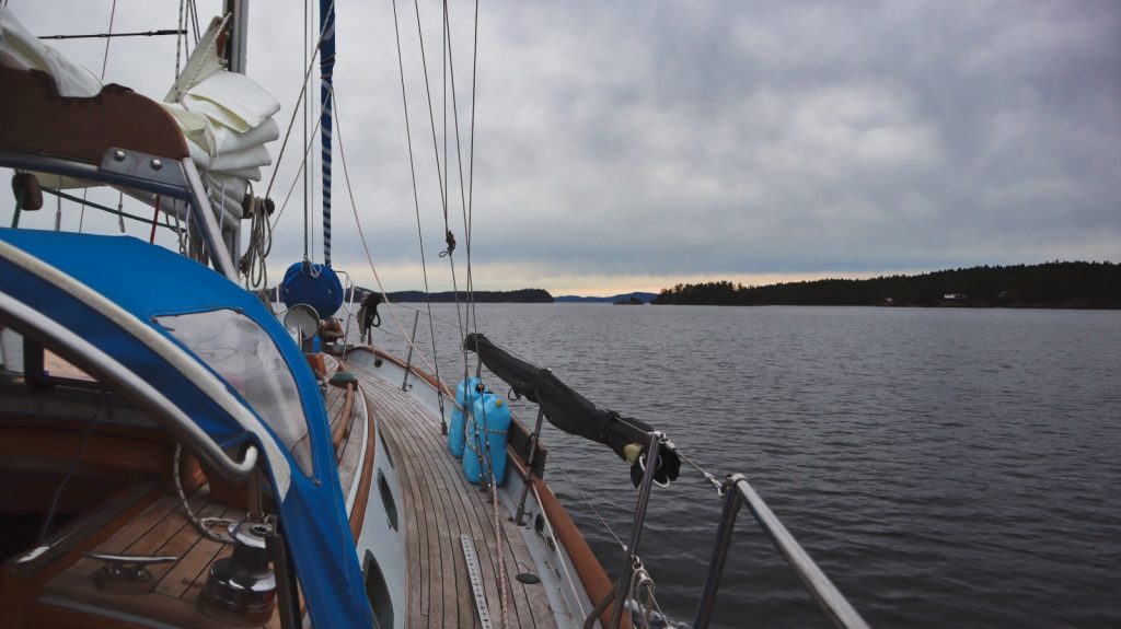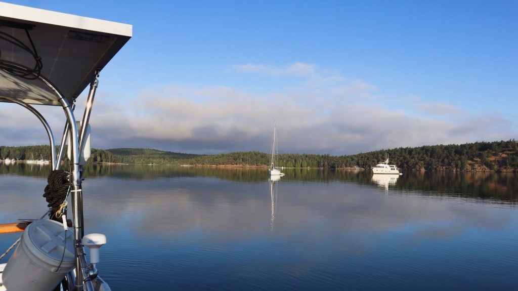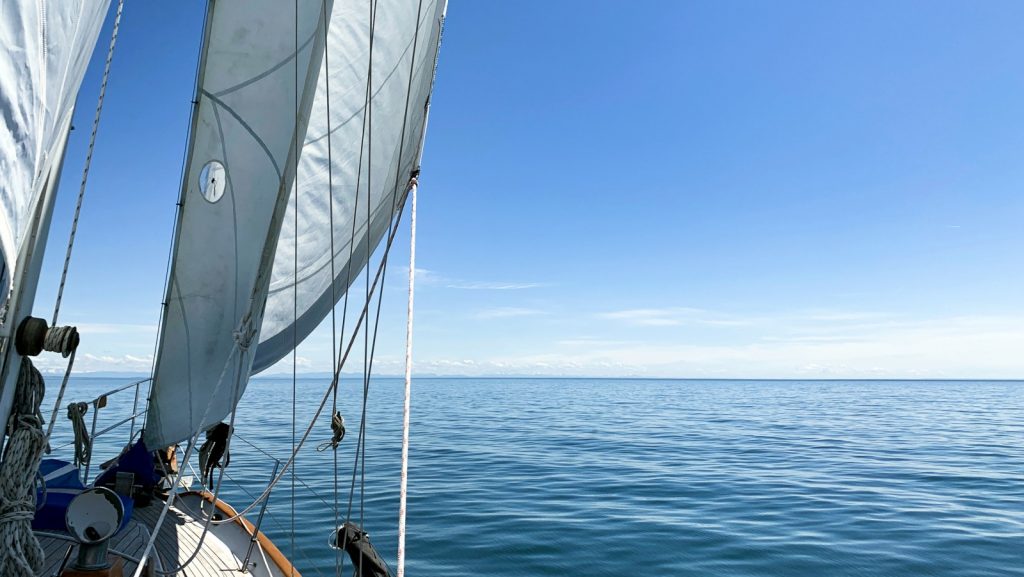 Day 2: 10am–9:15pm from Prevost Island to Lasqueti Island, 58 nautical miles, mostly by motor. Unlike yesterday, when the forecast predicted no wind and we were given pretty great wind for sailing, this time the forecast predicted good wind, so we opted to take the straight of Georgia rather than the more scenic route between islands to take advantage of the wind. Unfortunately, the forecast was wrong again this time, and we couldn’t keep enough wind in our sails to not backwind with every swell, and spent most of the day motoring. We raised anchor bright and early at 6am this morning on a favorable current, to motor to Hornby Island, await more favorable currents (and maybe some wind?), and make the bulk of the rest of today’s passage later today.