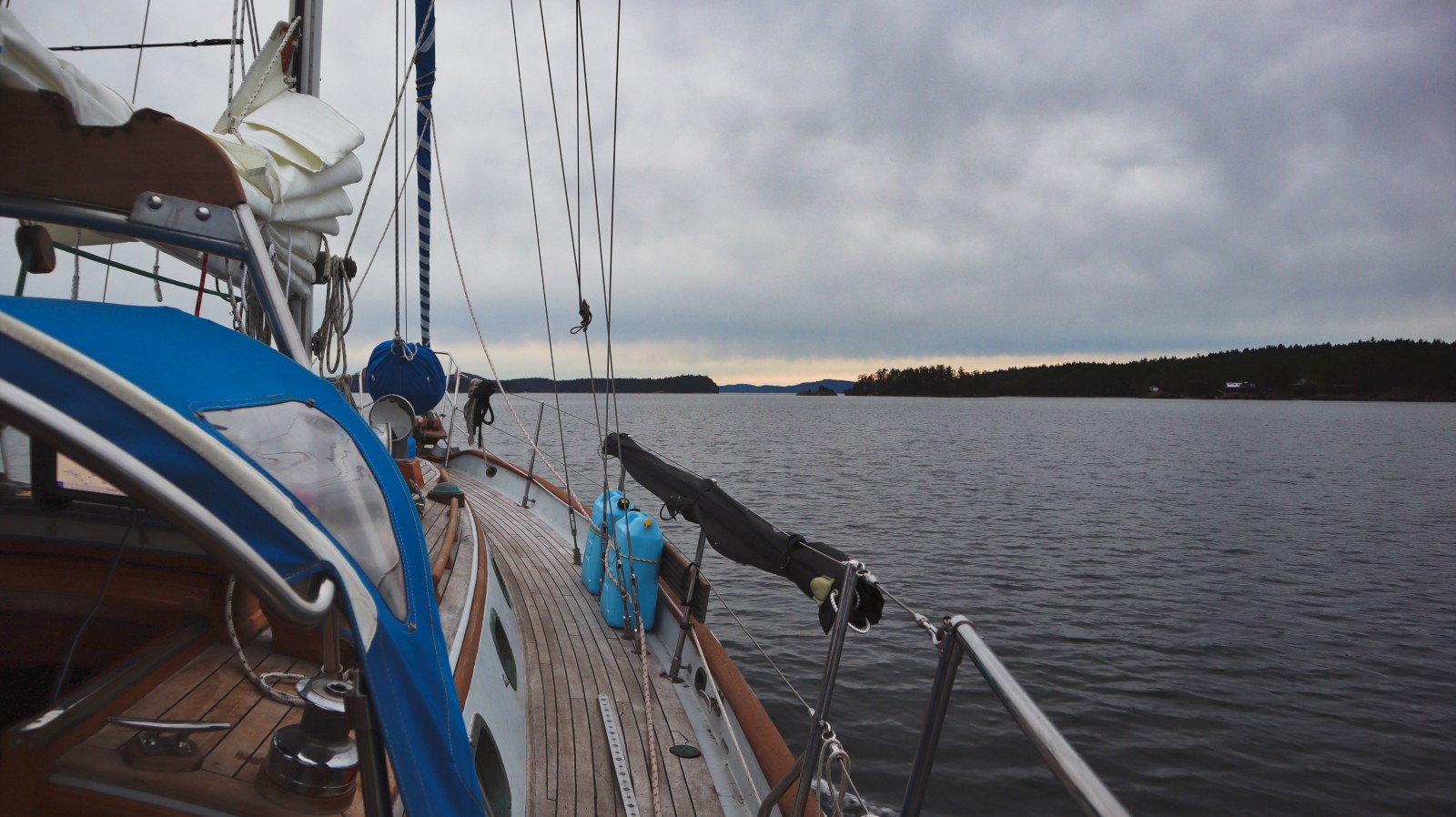 Day 2: 10am–9:15pm from Prevost Island to Lasqueti Island, 58 nautical miles, mostly by motor. Unlike yesterday, when the forecast predicted no wind and we were given pretty great wind for sailing, this time the forecast predicted good wind, so we opted to take the straight of Georgia rather than the more scenic route between islands to take advantage of the wind. Unfortunately, the forecast was wrong again this time, and we couldn’t keep enough wind in our sails to not backwind with every swell, and spent most of the day motoring. We raised anchor bright and early at 6am this morning on a favorable current, to motor to Hornby Island, await more favorable currents (and maybe some wind?), and make the bulk of the rest of today’s passage later today.
