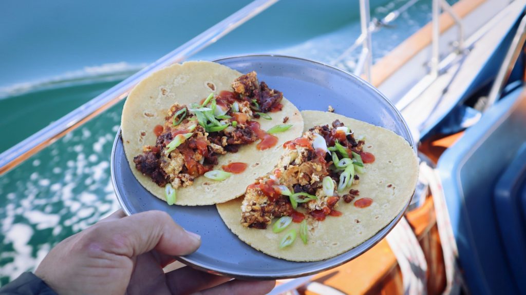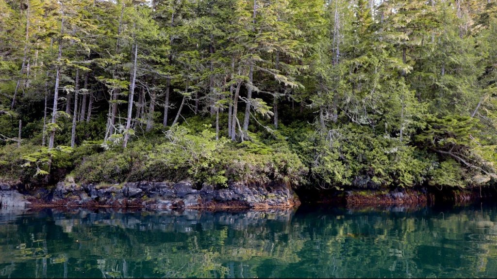 Day 5: 36 nautical miles. We weighed anchor at peaceful Tuna Point, with just this cabin with the tractor tire dock overlooking us. It seems unoccupied (by the living anyway), but I swear the door wasn’t cracked open when we pulled in the night before. We’ve been choosing anchorages by pure convenience—whatever’s a quick stop from our route, in and out—but you just can’t mess up the scenery here. Nearly every place we’ve stopped has rivaled or surpassed even the most beautiful anchorages in the San Juans. I prepared some some machaca tacos while under way, always a good way to start the day. This day was all motoring, save an ill-fated attempt to fly the spinnaker, which filled up perfectly for about 30 seconds, before the wind decided to stop completely. Tim helmed the entire time, while I went below to get more work done. We arrived at our next anchorage, a gorgeous, tiny channel between north Pearse Island and its neighbor, by around 3pm. Finished work, ate, and enjoyed the warm evening out on the deck drinking a cockpit cocktail, and watching the jellyfish drift by in the current.