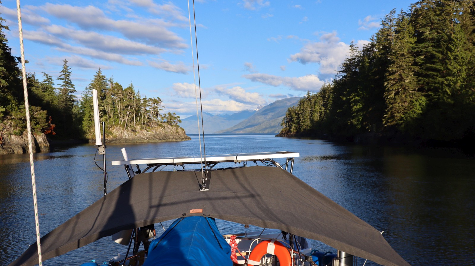 Day 5: 36 nautical miles. We weighed anchor at peaceful Tuna Point, with just this cabin with the tractor tire dock overlooking us. It seems unoccupied (by the living anyway), but I swear the door wasn’t cracked open when we pulled in the night before. We’ve been choosing anchorages by pure convenience—whatever’s a quick stop from our route, in and out—but you just can’t mess up the scenery here. Nearly every place we’ve stopped has rivaled or surpassed even the most beautiful anchorages in the San Juans. I prepared some some machaca tacos while under way, always a good way to start the day. This day was all motoring, save an ill-fated attempt to fly the spinnaker, which filled up perfectly for about 30 seconds, before the wind decided to stop completely. Tim helmed the entire time, while I went below to get more work done. We arrived at our next anchorage, a gorgeous, tiny channel between north Pearse Island and its neighbor, by around 3pm. Finished work, ate, and enjoyed the warm evening out on the deck drinking a cockpit cocktail, and watching the jellyfish drift by in the current.