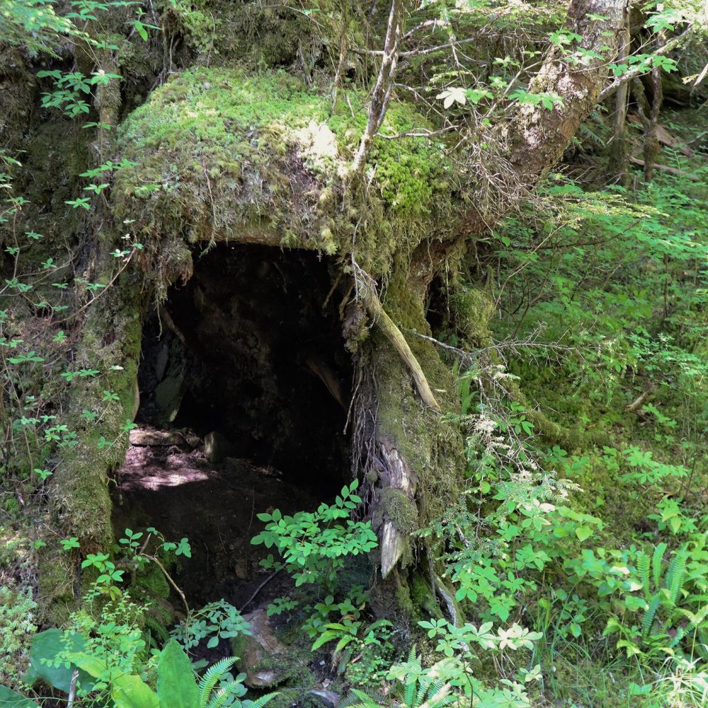 The cave was actually just a tree that had once grown over a large stump, which has since decayed away leaving only the live tree in place.