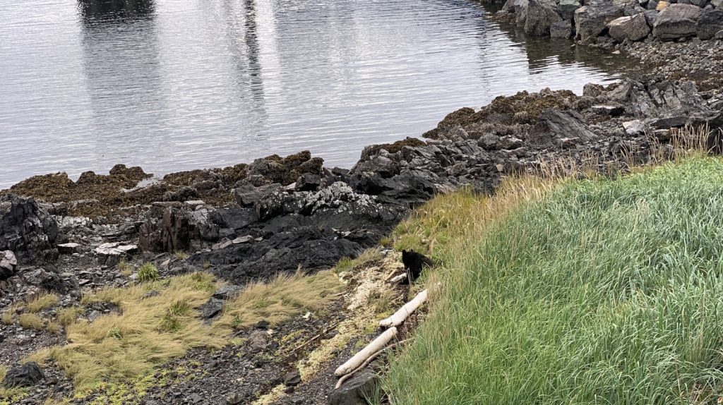 At Kake, we arrived to the fuel dock first. The actual fuel dock was damaged some years back and has yet to be replaced. So, the local fuel station delivers fuel to a neighboring dock via a truck. One only needs to call ahead and place the order, which we did. A quick walk to the only grocery store in town was shortest from said fuel dock, so we took advantage. And wouldn’t you know it, our first bear sighting (right off the roadway) other than the bears at Anan.