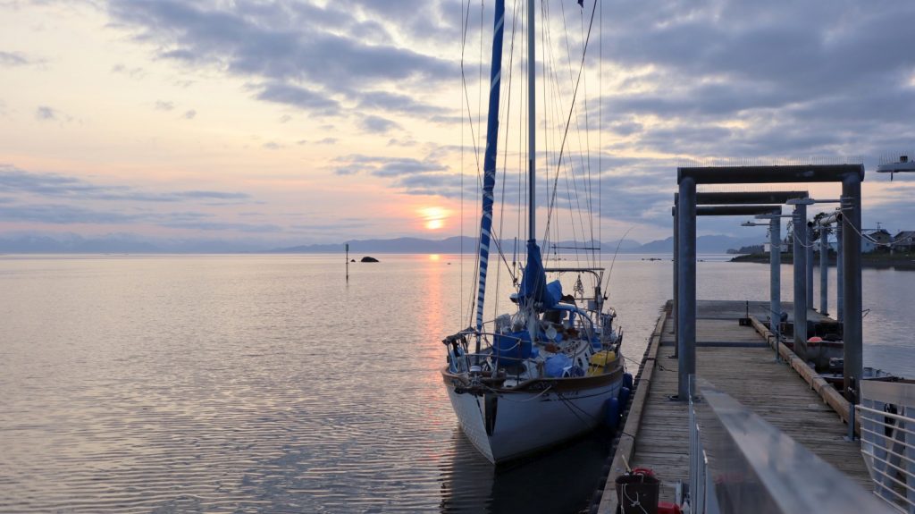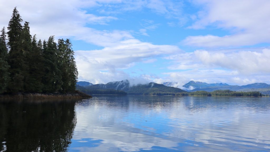 I typically don’t find dockside moorage to be the more scenic of the places we stay, but the city dock at Kake has spectacular panoramic views, and gave us a long, lovely pastel sunset last night before the storm started up today. Rudy, a Kake resident and city worker came by to give us the rundown on town, ask us a few questions about what we think cruisers want to see out of their town, and have us sign a letter expressing our support for funding dock improvements. He told us some history of the town and how the tribe used to be scattered throughout the islands until most ended up here in OVK (Organized Village of Kake). (Come to find out after later research, no surprise, in part because the US Navy destroyed three of the other Kake villages). He pointed out the group of islands across the way, which host their burial grounds. In the other direction toward land, on a hill above the liquor store and next to the cell tower (the main public businesses in town comprise of it, a market, and a fuel station) is what was once the World’s Tallest Totem Pole, but the top fell off a few years ago, so now it’s the World’s Third Largest Totem Pole. Not a bad run for a totem that was erected in the seventies. – Kerri