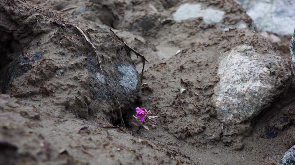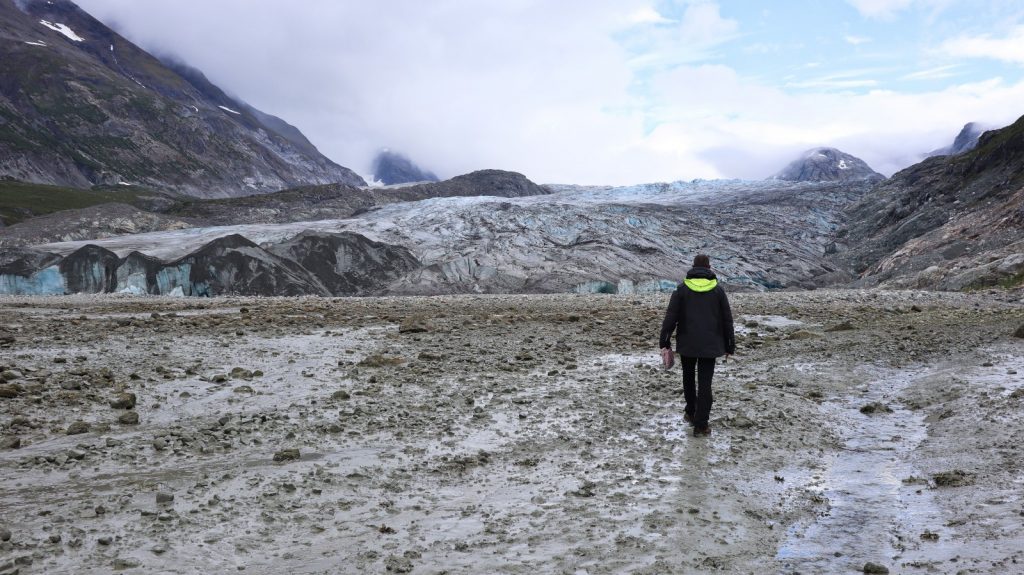 We chose instead to turn tail and head back to Reid Inlet where we could anchor and get out for a hike to the glacier. Or so we thought anyway. The glacier has a wide moat of ice water protecting it from the grubby hands of humans. Fair enough, I get it. The hike was still out of the world – literally. Mostly rock and the finest silt/mud I have ever felt (it was nearly a cream). Furthest from the glacier itself is showing how life begins taking over the newly* exposed land. Closer to the glacier and the land gets more barren and rocky.
